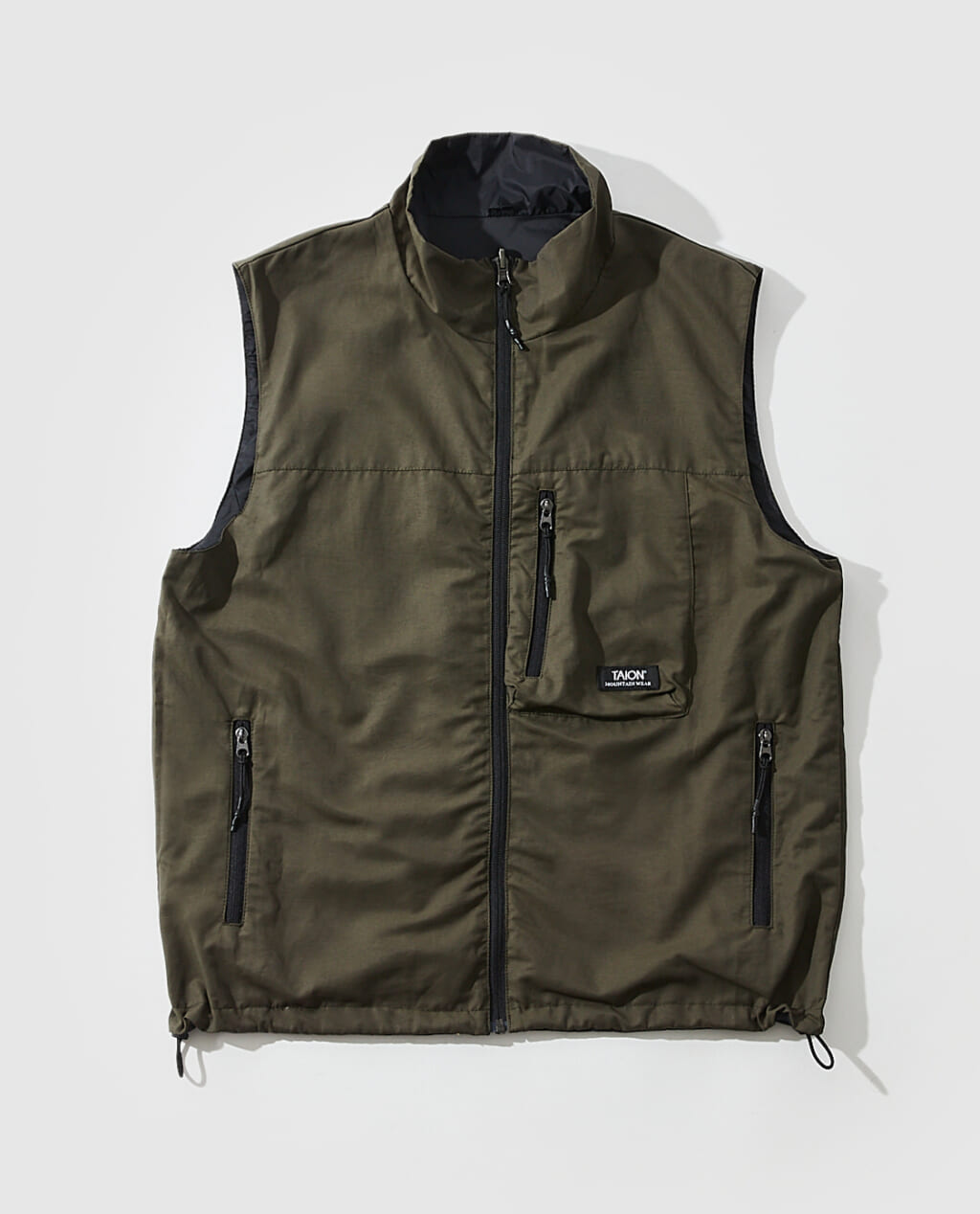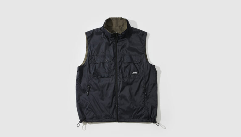 ハイネックのWジップベストは、春夏もレイヤリングコーデが楽しめるアイテム。こちらもアノラックと同じく、高密度ナイロンのマイクロリップストップ生地と60/40クロスのリバーシブル仕様。