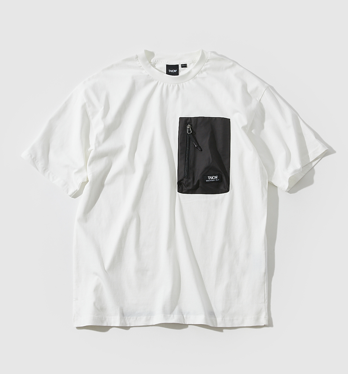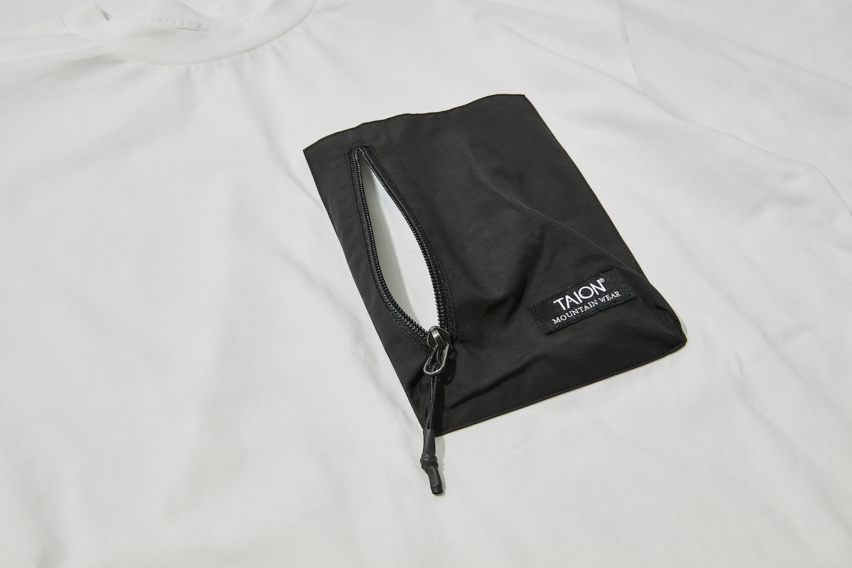 マウンテンラインにはTシャツもあるが、こちらは胸元にナイロン生地のファスナーポケットを配した、タイオンらしい1枚に仕上げられている。ボディは5オンスのコットン生地。丈夫で肌馴染みがよく、着込むほど風合いも増す。
