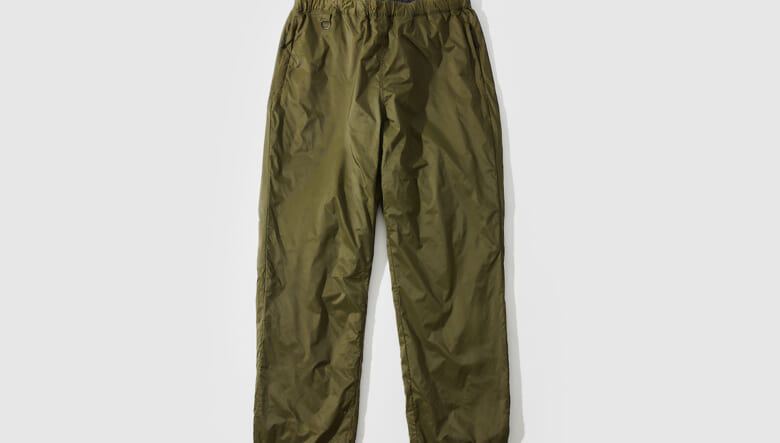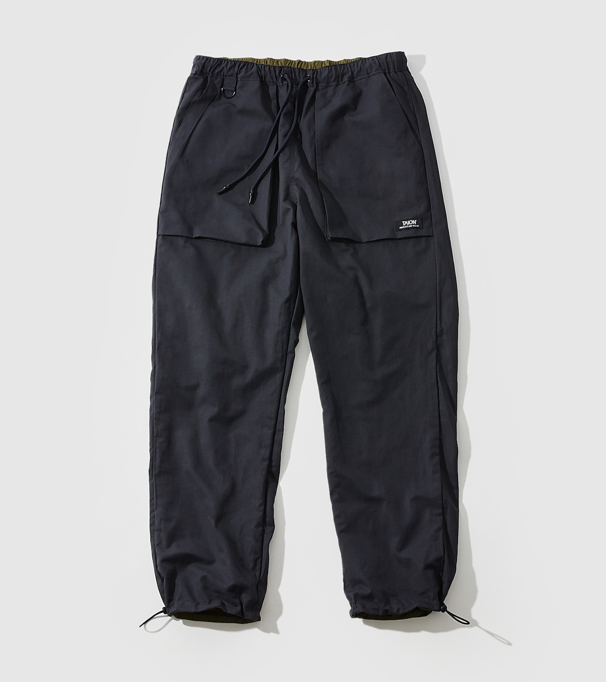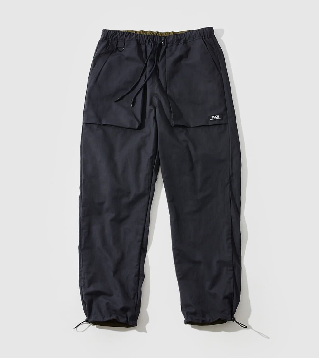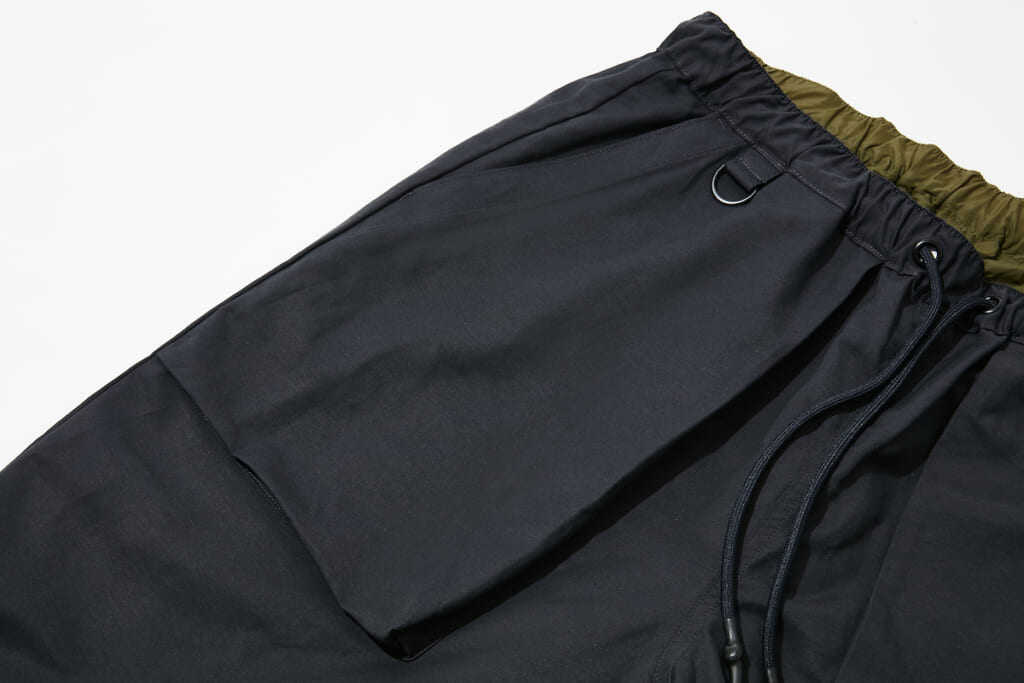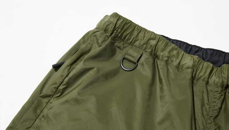 ショーツと同素材でリバーシブル仕様となったイージーパンツもあり。ほどよくゆとりのあるシルエットで、裾にはアジャスターも装備。スタイルに合わせて足元をスッキリさせることもできる。