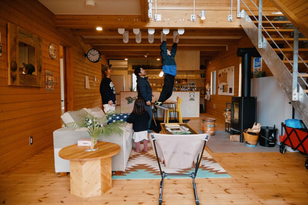 アスレチックのように遊べる室内のウンテイに楓くんが挑戦! 遊具や吊り下げ式の時計など、直接壁や天井に設置できるのも無垢材を使用した内装ならでは。