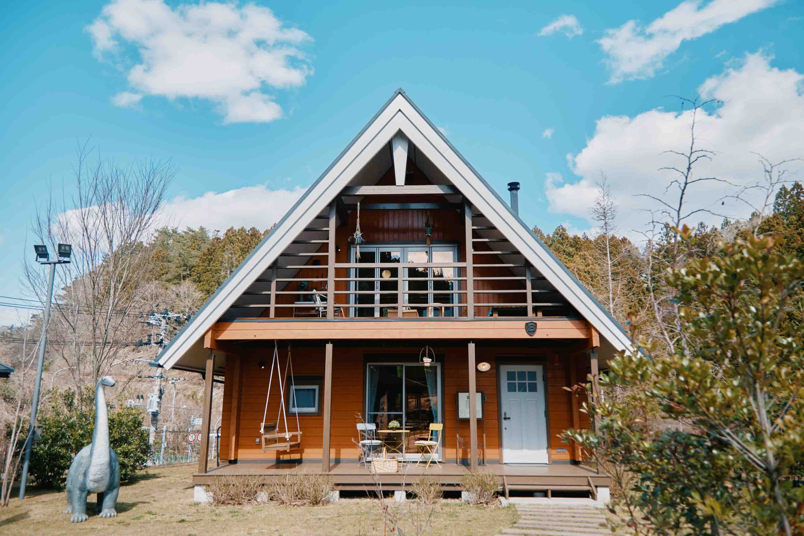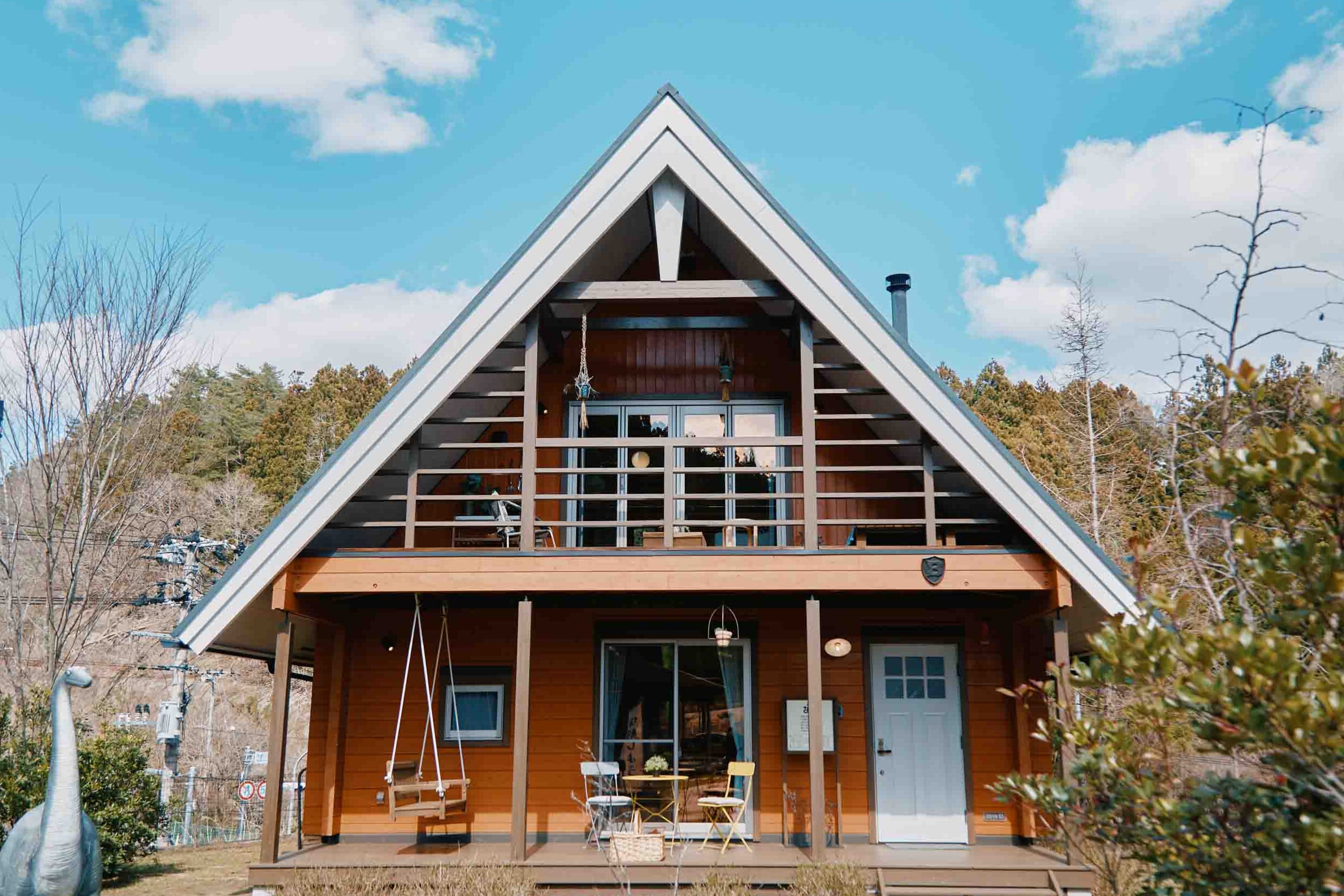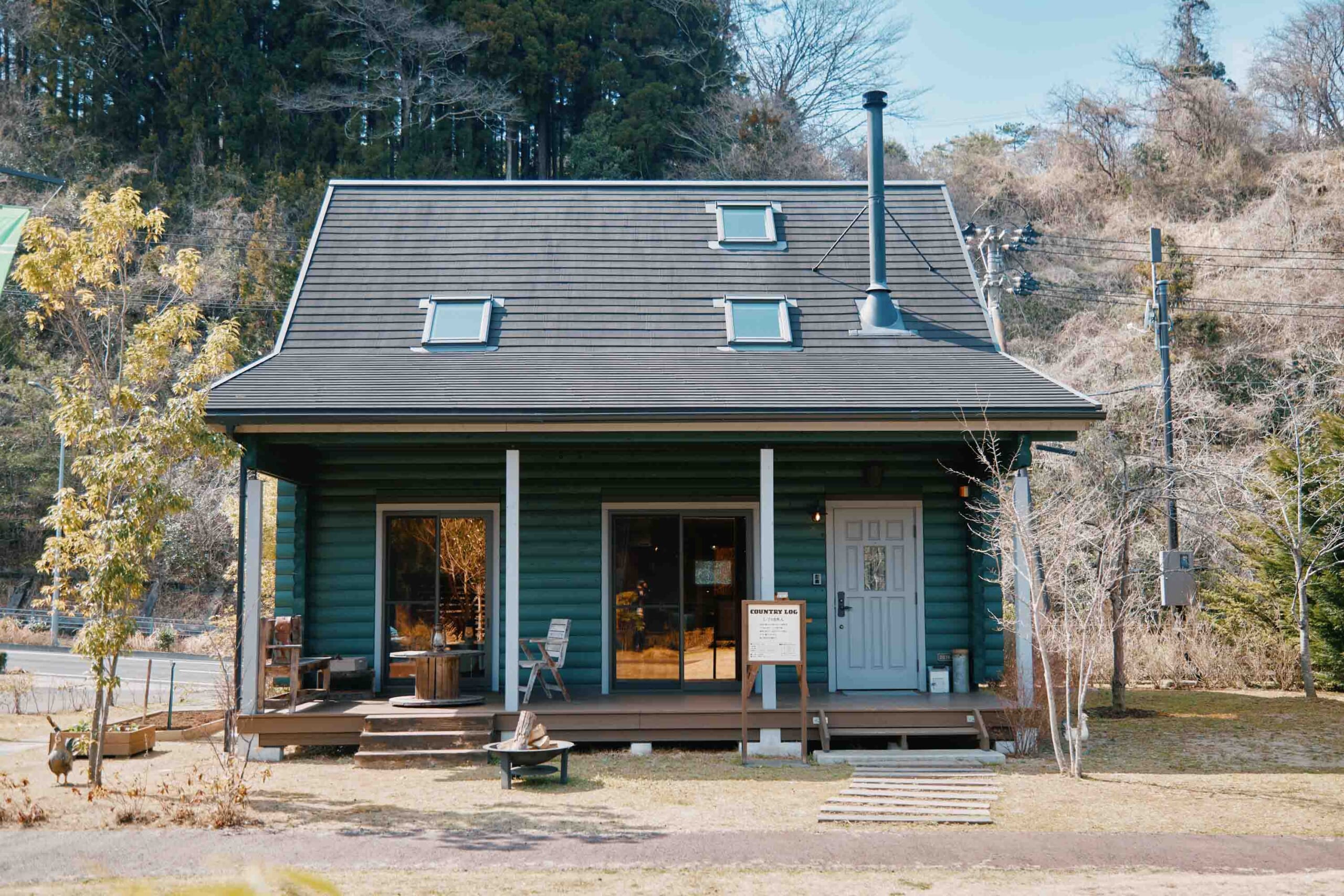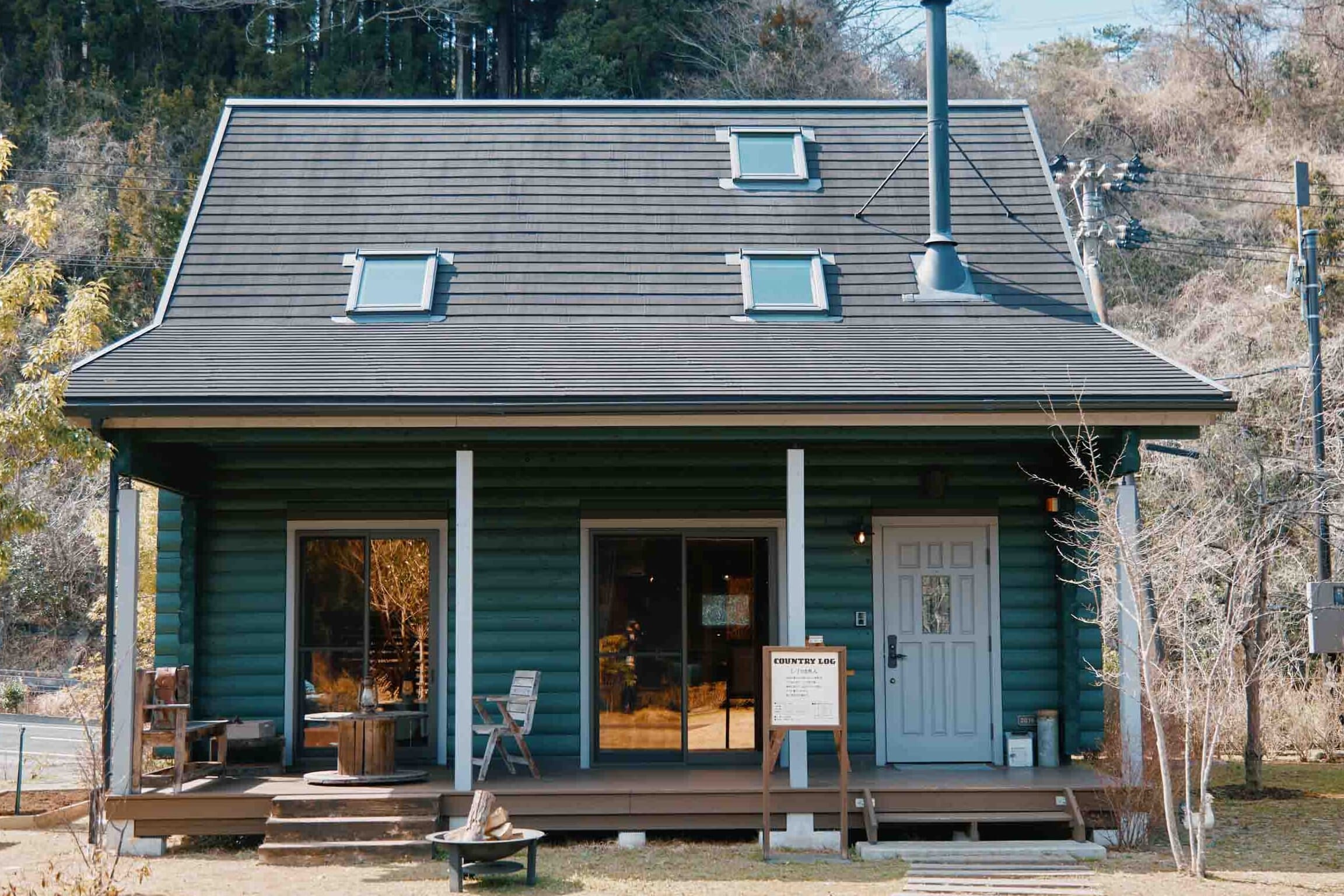 ログハウスと相性抜群な薪ストーブの魅力をもっとも感じられたという“カントリーログ”。無垢材を積み上げた重厚感のあるルックスで長折れ屋根の軒下にウッドデッキを備えた、正統派ログハウスは、入ってすぐの玄関兼土間スペースが汚れたら掃除しやすいことも特徴。冬は薪ストーブの炎と木の爆ぜる音がカラダも心も温めてくれる。