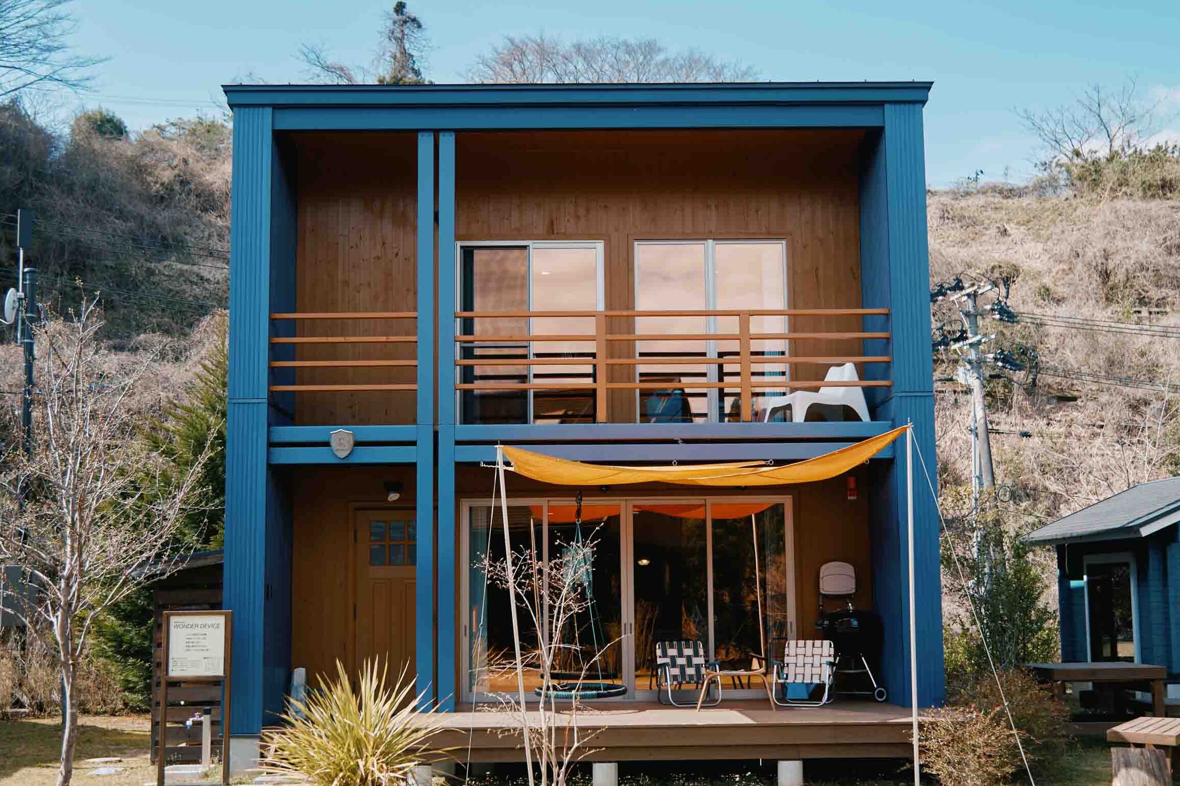 象徴的なクロスした2本組みスチールの柱、開放感のあるウッドデッキやベランダを備えた“ワンダーデバイス”の“フランク”。表に設置されたスチール製の柱や室内の梁にはアンカーが打ち込まれており、いろいろなアイテムを吊るすことができる。