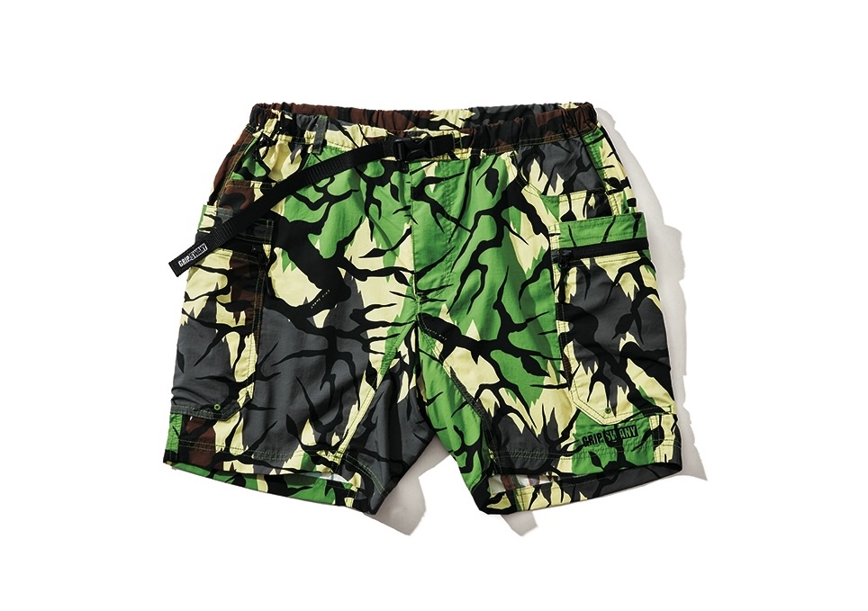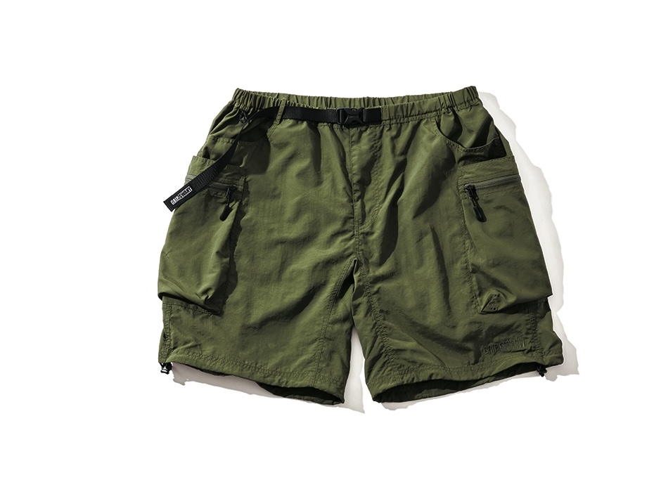 キャンプ&ストリートコーデの鉄板に定着したサプレックスナイロン採用のギアショーツは、9つもポケットを装備しているので手ブラ活動に最適。座った時にスマホが干渉しないよう、右腰後ろに専用ポケットを配しているのもグッド。撥水性に優れ、雨天時や水まわりでの着用もOKだ。