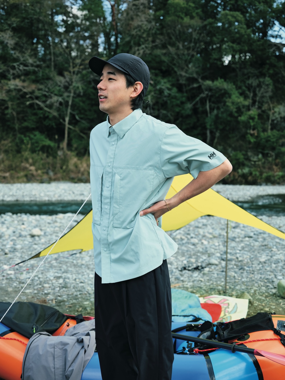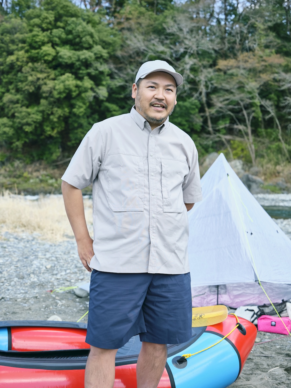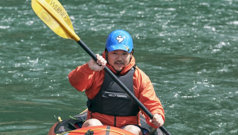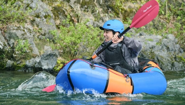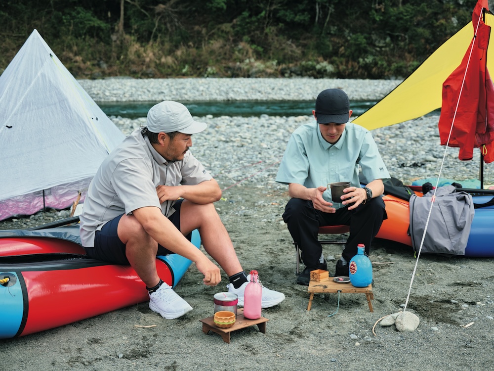 キャンプだけではなく、パックラフトや渓流釣りなどのアクティビティを楽しむペイさんに弟子入りしたのは、モデルやショップ店員として活躍する笹本海都さんa.k.a.小魚くん。スリル満点の川下りにすっかり魅了された模様。