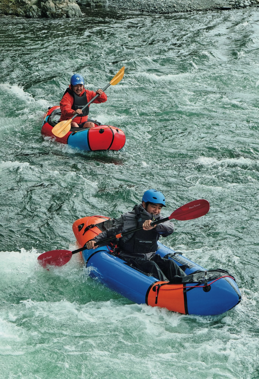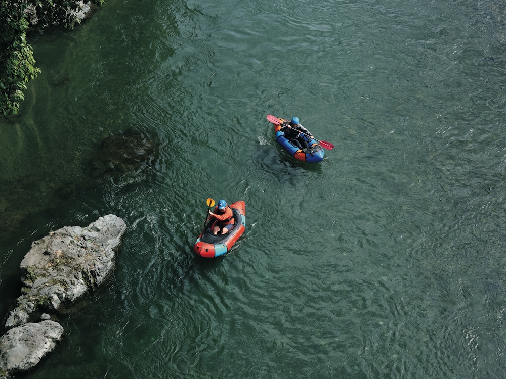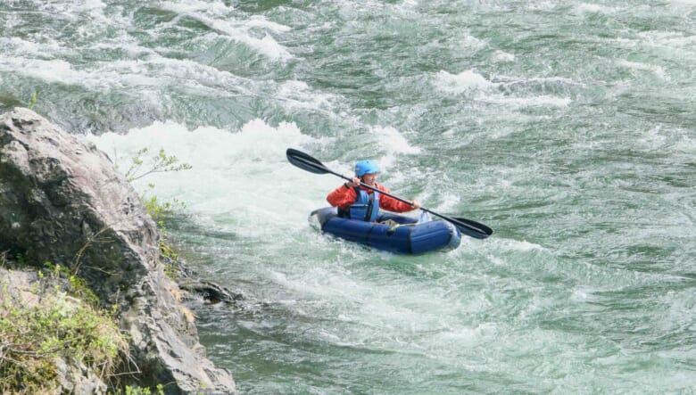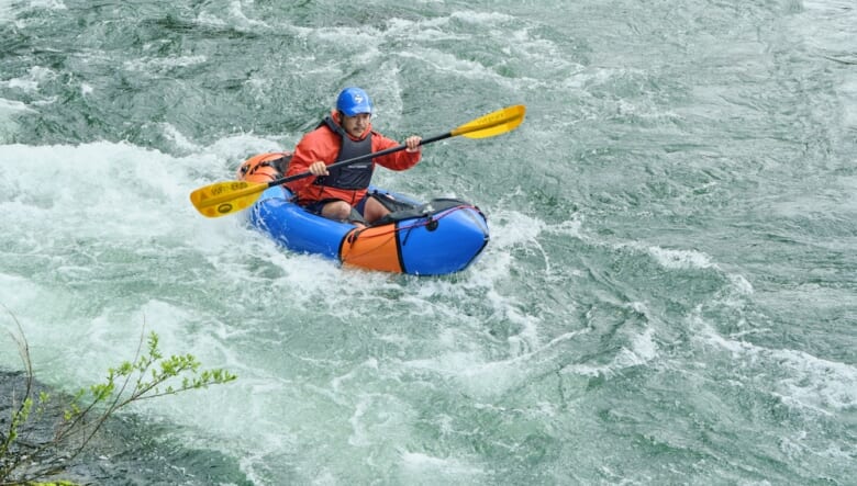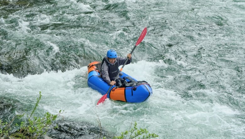 キャンプだけではなく、パックラフトや渓流釣りなどのアクティビティを楽しむペイさんに弟子入りしたのは、モデルやショップ店員として活躍する笹本海都さんa.k.a.小魚くん。スリル満点の川下りにすっかり魅了された模様。