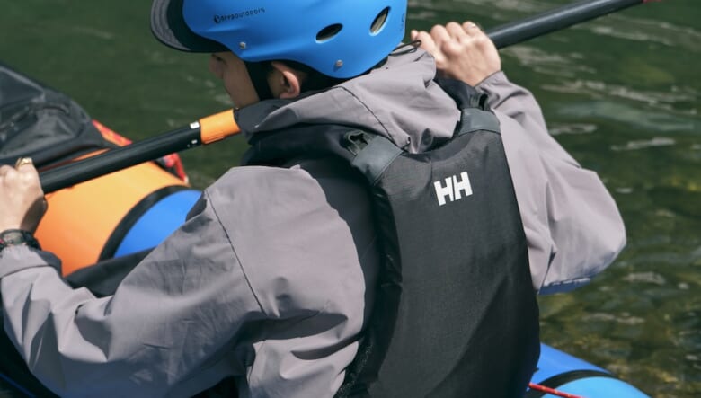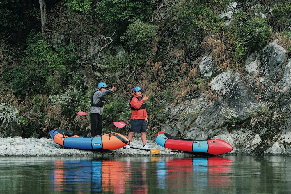 アクテビティの達人ペイさんに連れられて、パックラフト初体験にやってきた笹本さん。インフレータブルのボートで本格的な川下りを楽しむべく2人が着用しているのは、軽い着心地が魅力的なジャケット。