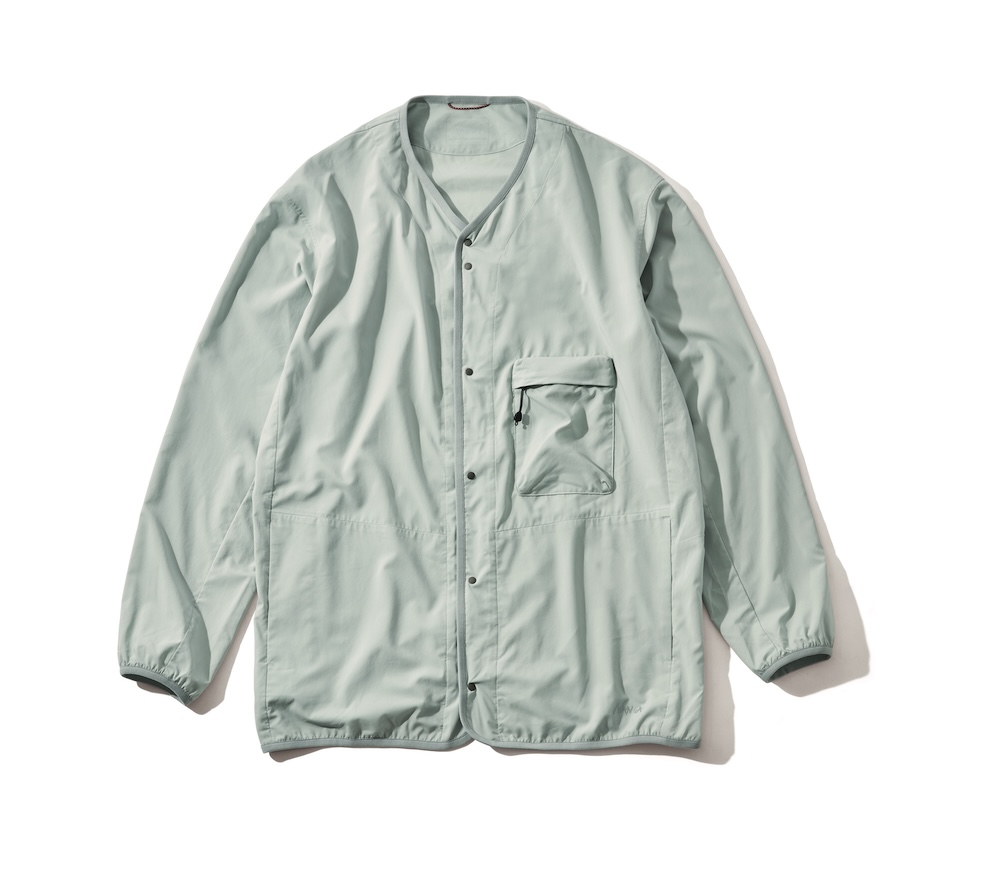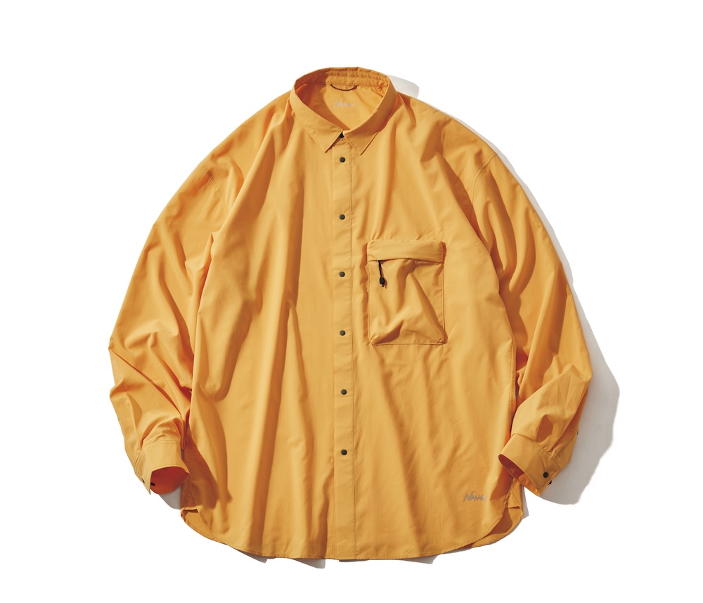 ベーシックなデザインの長袖シャツは、フロントをスナップボタンにすることでスポーティな印象をプラス。1枚でも活躍してくれるが、ライトアウター感覚でTシャツとのレイヤリングも可能。左胸のポケットに本体を収納できるパッカブル仕様。