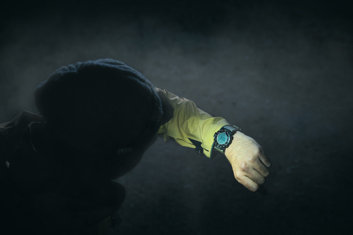 まずはナイトハイクの登山から。ご覧の通り、暗闇のなか、トレッキングポールを手にして歩くなかでもしっかりと発光し、ハッキリと時間を読み取ることができる。
