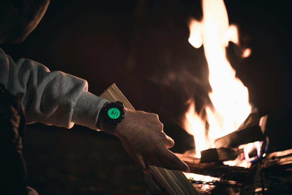 刻を忘れて火の世話に夢中になりそうだけど、そんなときでもしっかりと腕元で光ってくれている。一緒に焚き火を楽しむキャンプ仲間からも、「なにその時計?」って、注目を集めるほど目立っていた。