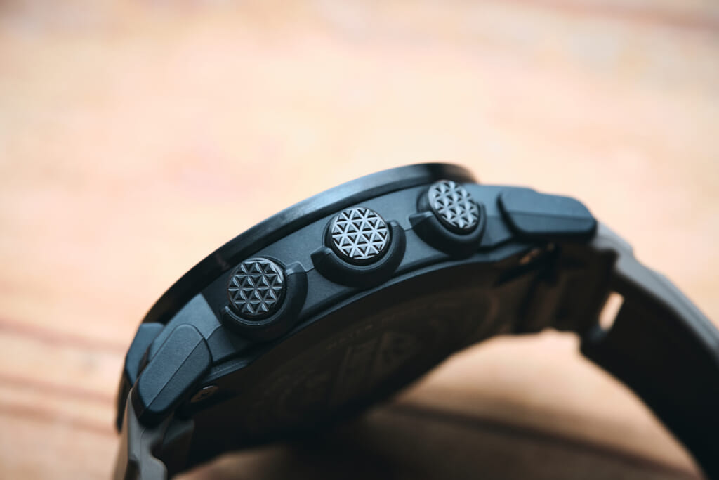 こちらは、透明度が高い反射防止コーティングが施された”サファイヤガラス”を搭載。ステンレスチールのベゼルとチタンムクのバンドも、傷がつきにくい”チタンカーバイト処理”が施されている。