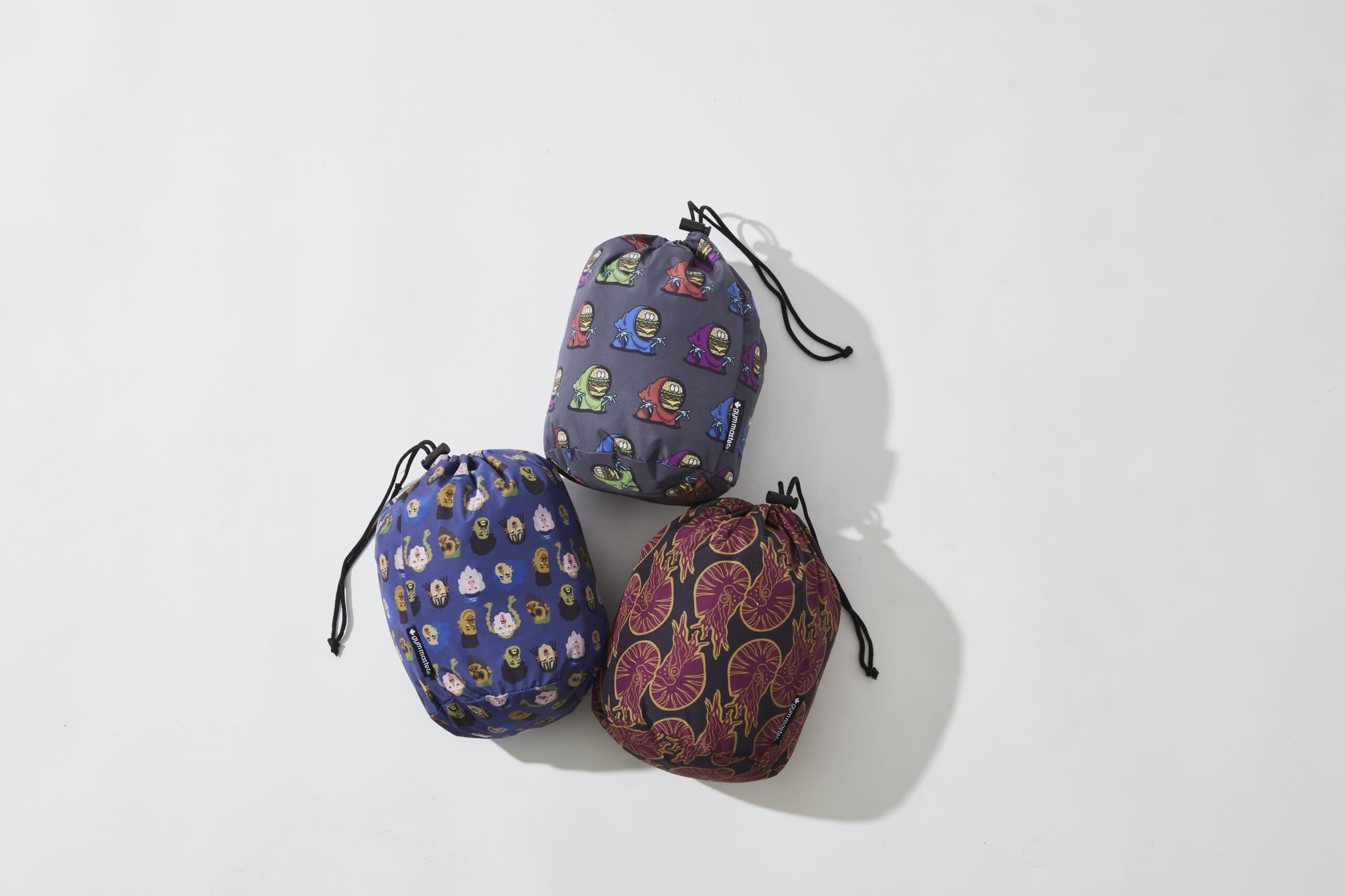 レインポンチョやレインコートは、付属のスタッフサックにコンパクトに収納して持ち歩ける。収納袋も本体のボディと同じ総柄プリントになっているため、家族分を柄違いで揃えておくと、急な雨でもわかりやすいかも?