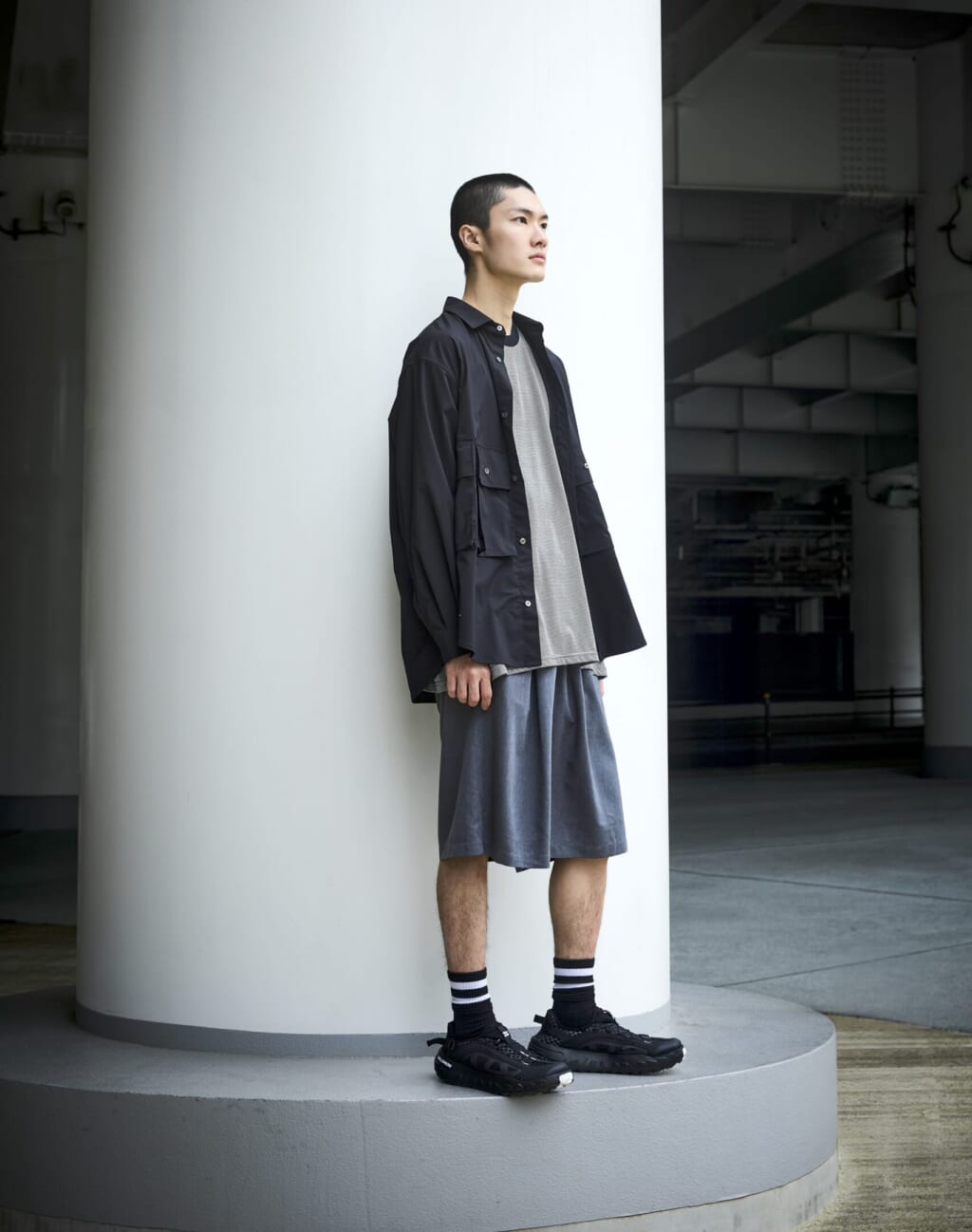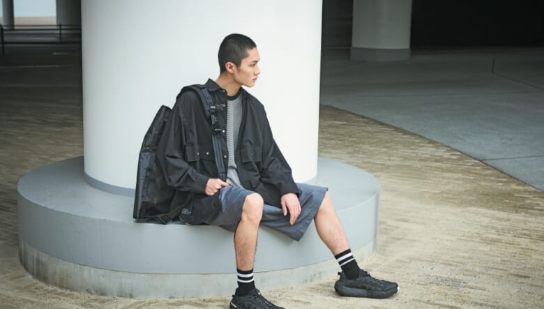 シューズ:ソランフィビアン¥17600/サロモン(サロモンコールセンター) シャツ¥26400、Tシャツ¥9900、ショーツ¥17600/すべてフレッシュサービス(フレッシュサービス ヘッドクオーターズ) バッグ¥55000/ミーンズワイル×クローム(ミーンズワイル)