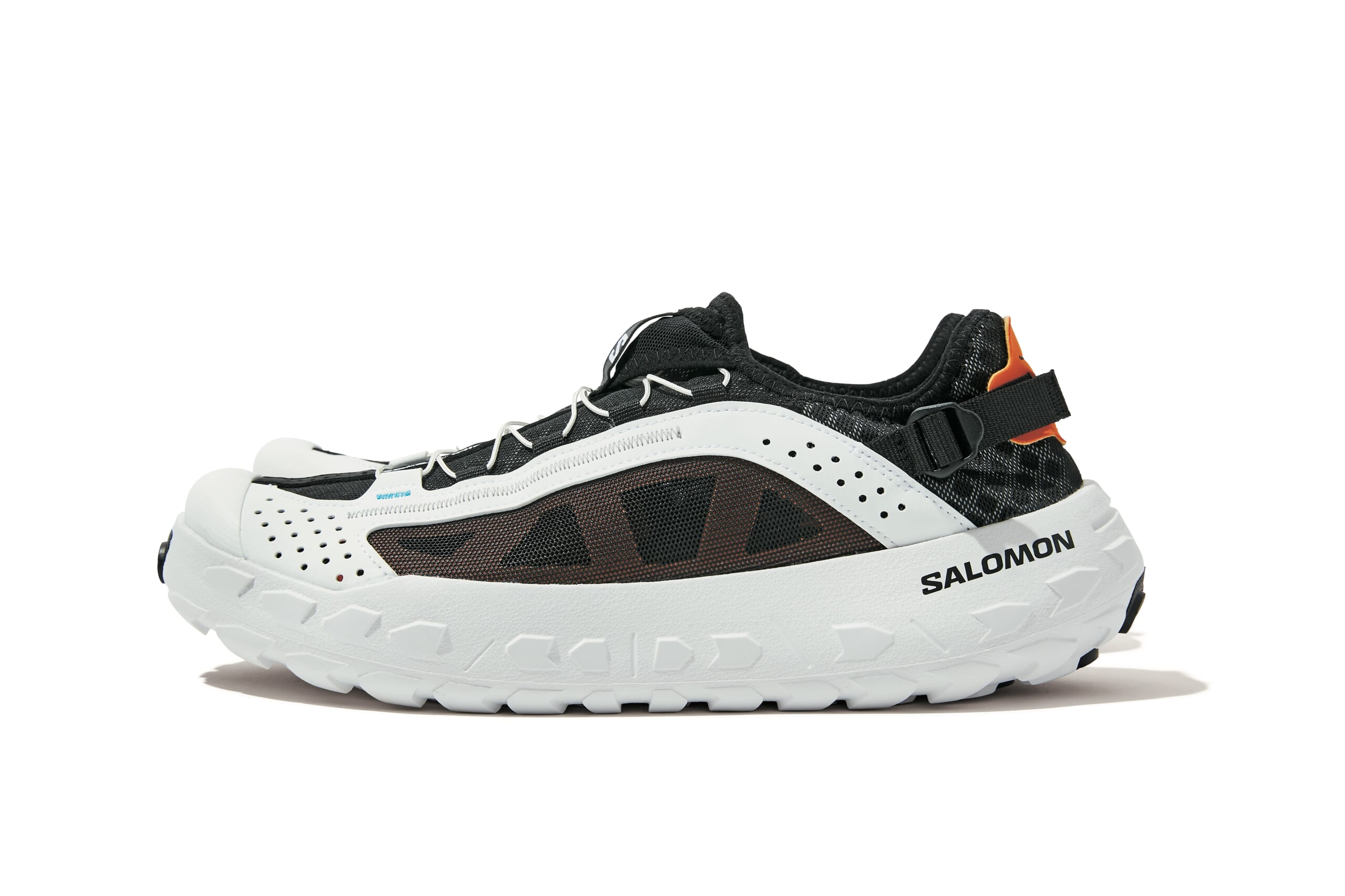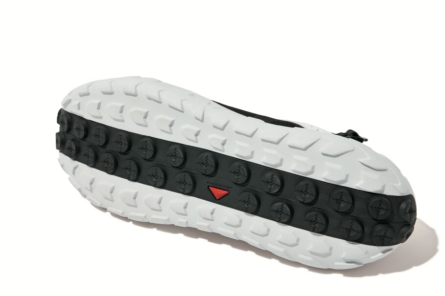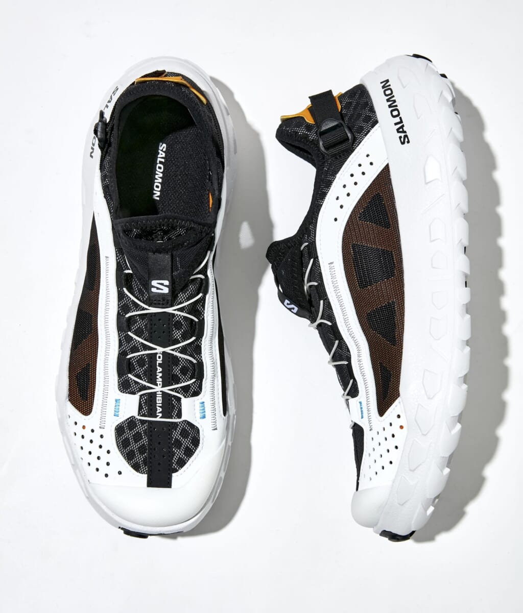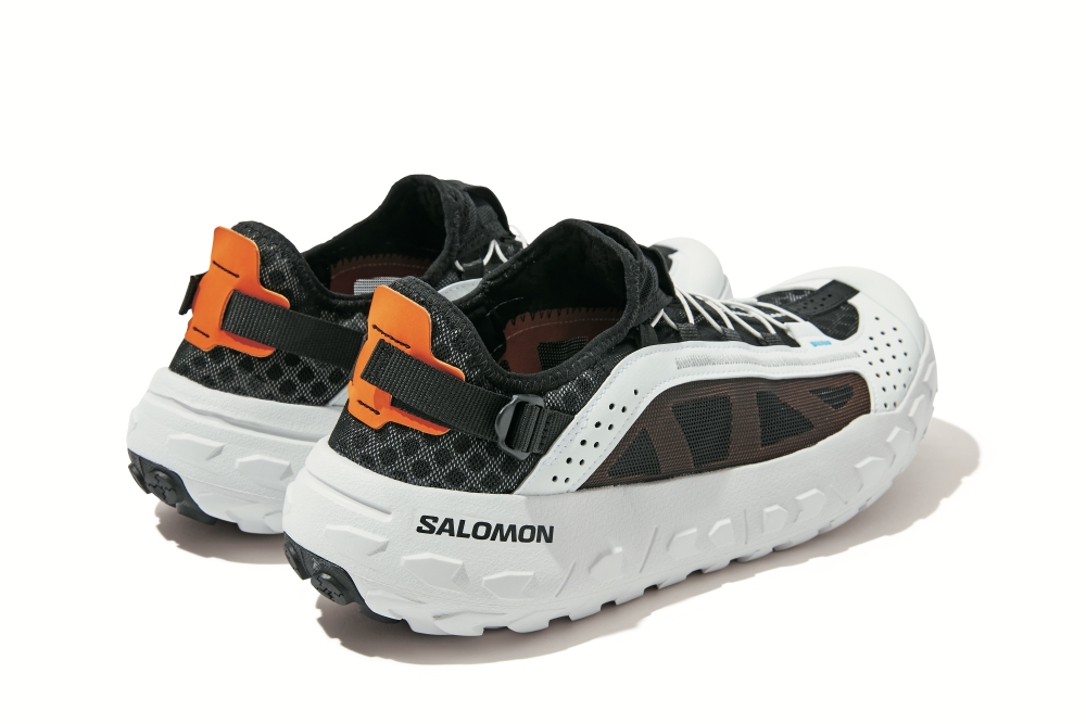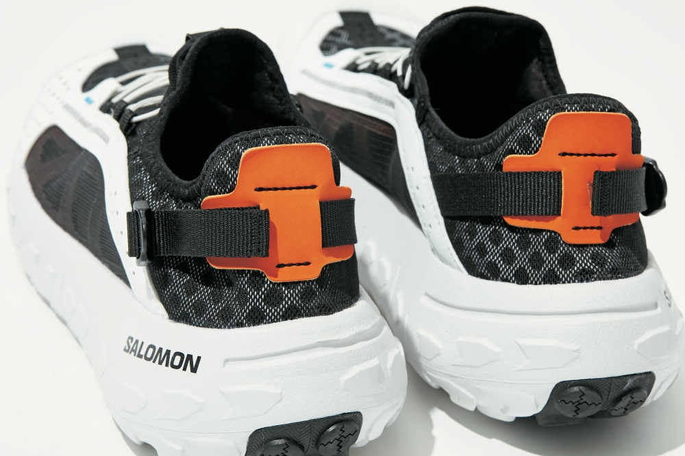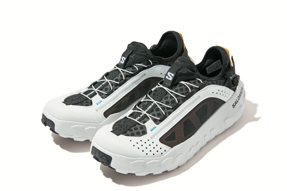 アッパーにはパーフォレーション加工の丈夫なメッシュ素材を採用。通気性と排水性に優れているため、瞬時に水を排出して素早く乾燥させる。サロモンお得意のクイックシューレースも装備。