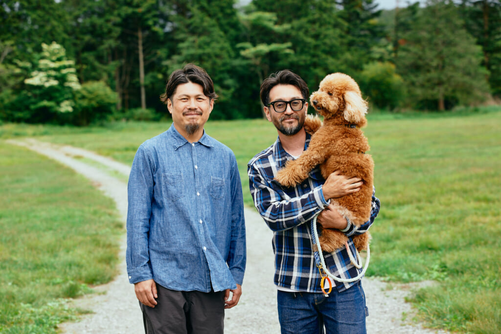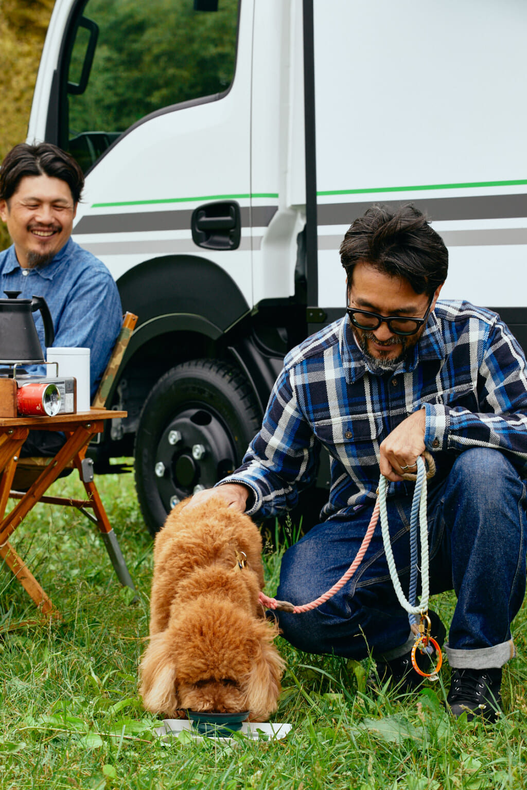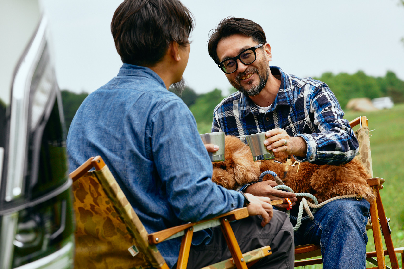カーサイドにテーブルやチェアをセッティングしたら2人+1匹でリラックスタイム。もともと田島さんが神保さん率いるSOUI WOODWORKSのセンスに惚れ込んでオフィスの内装を頼んだところからスタートした2人の関係。同い年で同じキャンプ好きということもあって、今は仕事にとどまらず、こうして一緒にキャンプにいくことも多いのだとか。