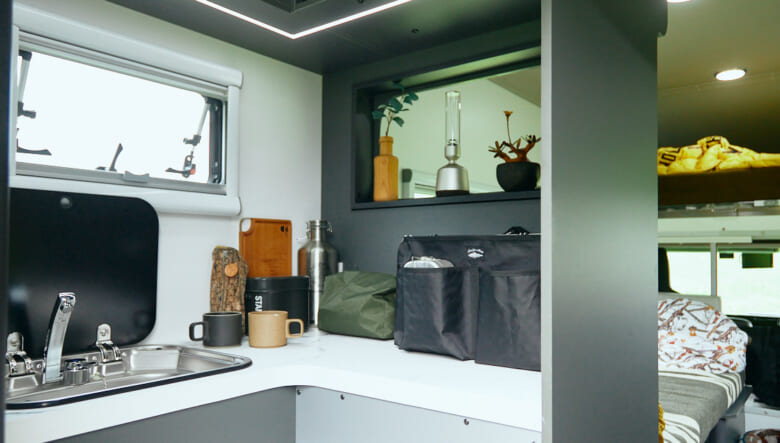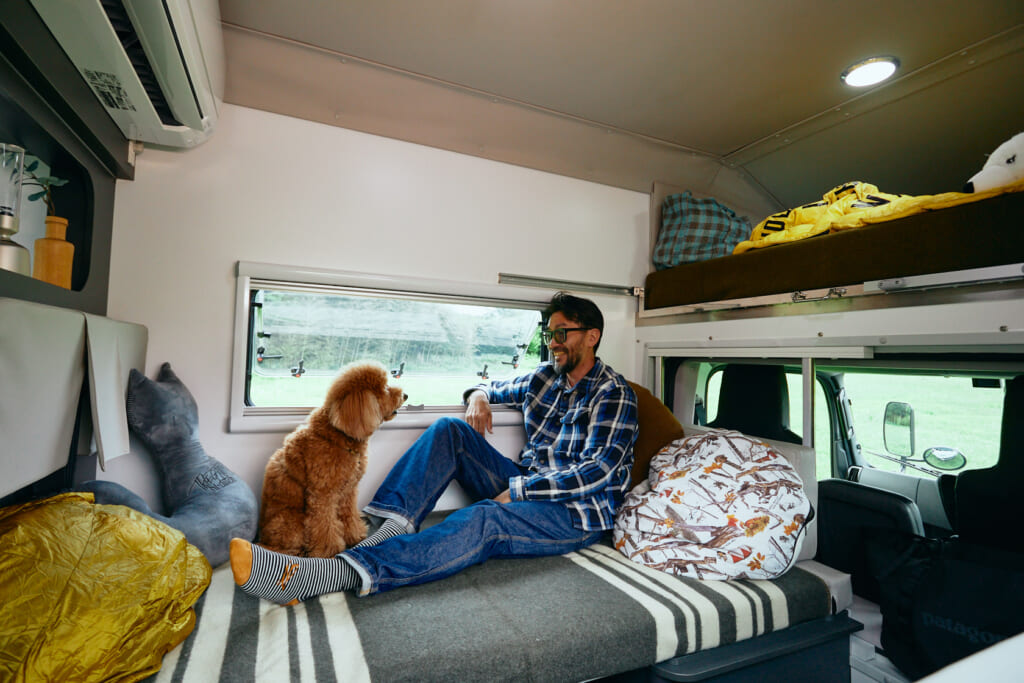 「トラックベースのキャンピングカーは室内が広いから、車内の導線も立って移動できてストレスフリーだし、キッチンでの作業も立ってできるから楽ですね。犬にとっても車内で動き回れるスペースがあるのは嬉しいと思います。あと、ベッドとは別に広い床面があるから犬用トイレを置きやすいのもポイントかな」。