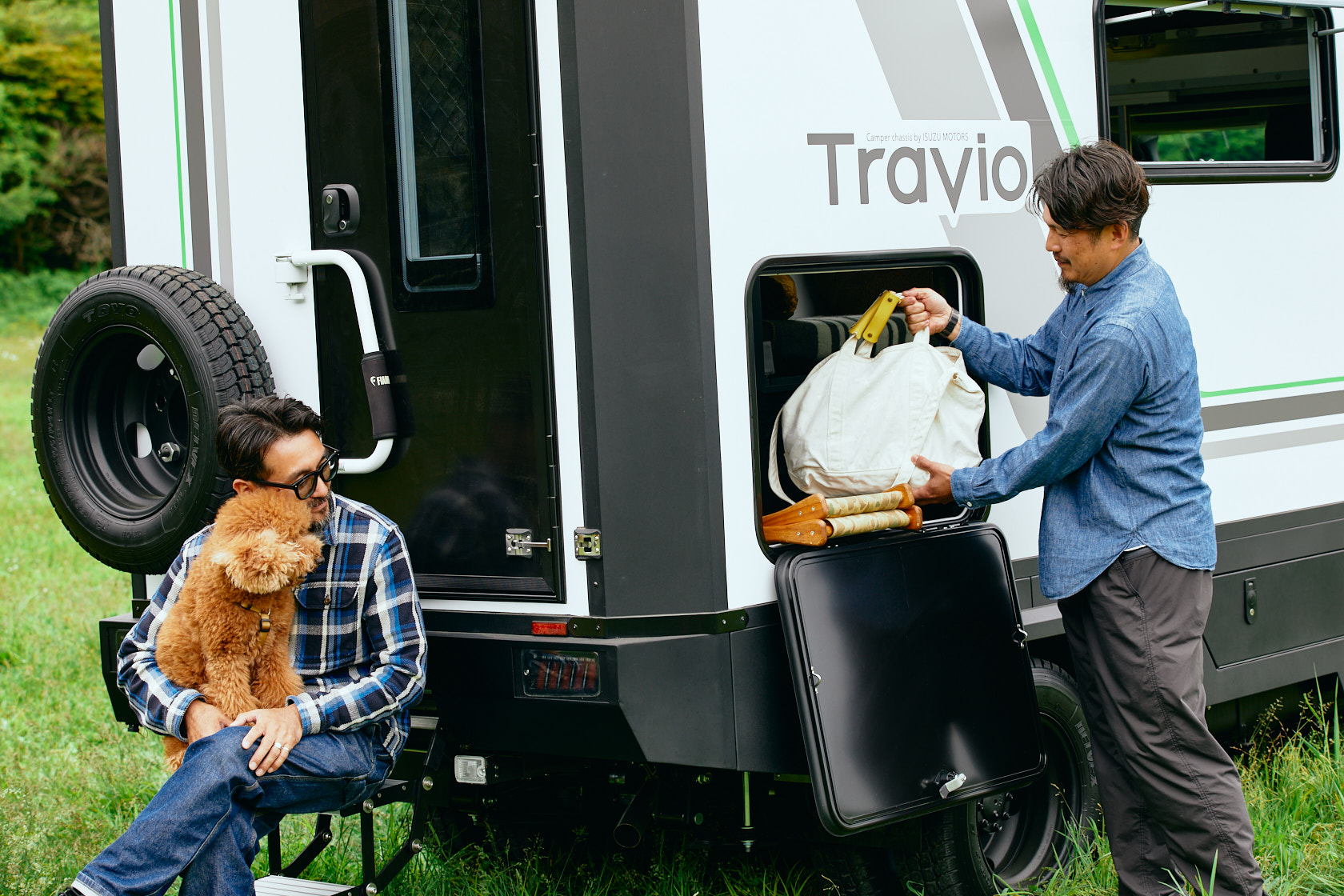 「荷物の取り出しはわざわざ乗り降りしなくても、ボディ右後部の大型バゲッジドアからサッと行えるから設営も楽ですね」。
