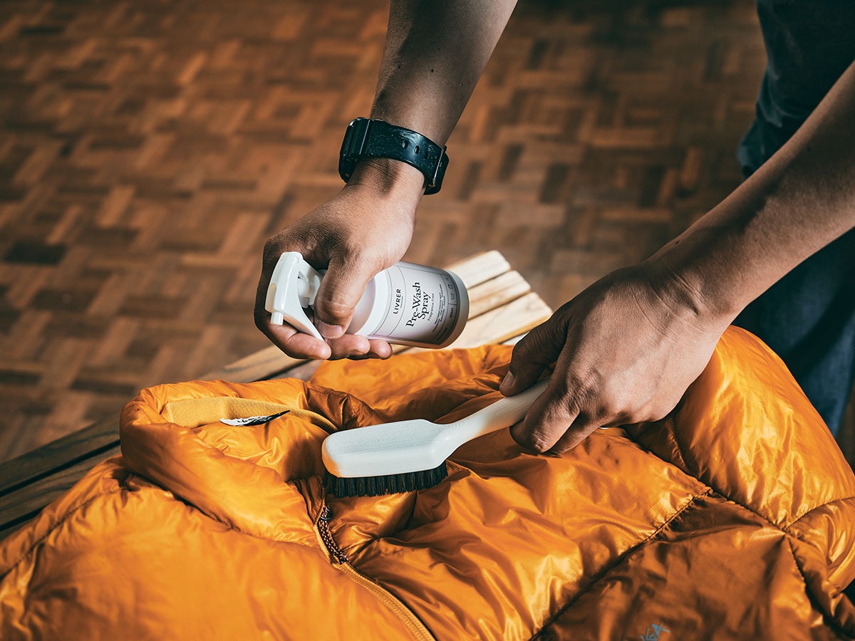 康之「ダウンジャケットには汚れやすい部位があります。襟ぐり、袖口、あと意外と見逃しがちなのがポケット口。そういった部位に、普段使っている洗剤と水を1:1で混ぜて、あらかじめ吹きかけておく。10分くらい経って生地に浸透したら、洗濯ブラシで叩いて汚れを浮かせます。その後に洗濯機で洗えばキレイになります。僕らもそのやり方で洗っています。あとは、洗濯機に入れる前にダウンジャケットをあらかじめぬるま湯に漬けておく。そうすると汚れが落ちやすくなります」
