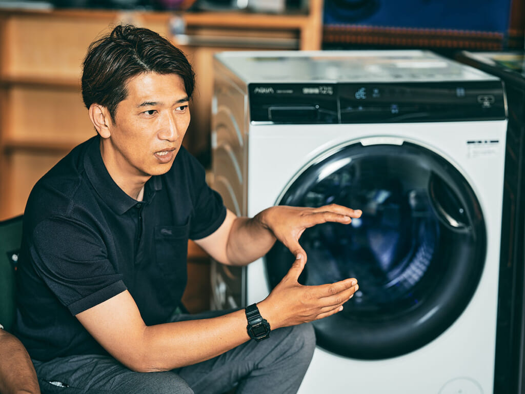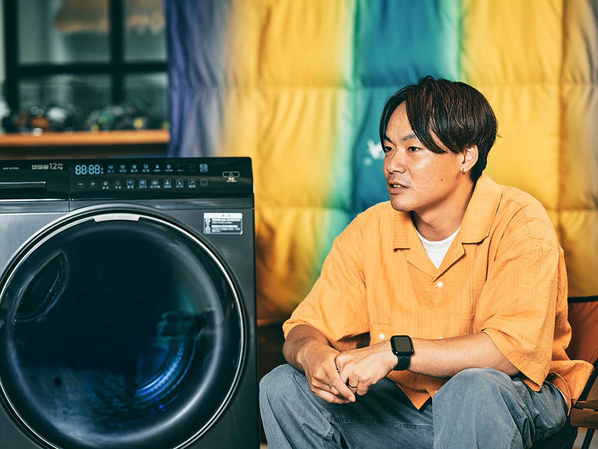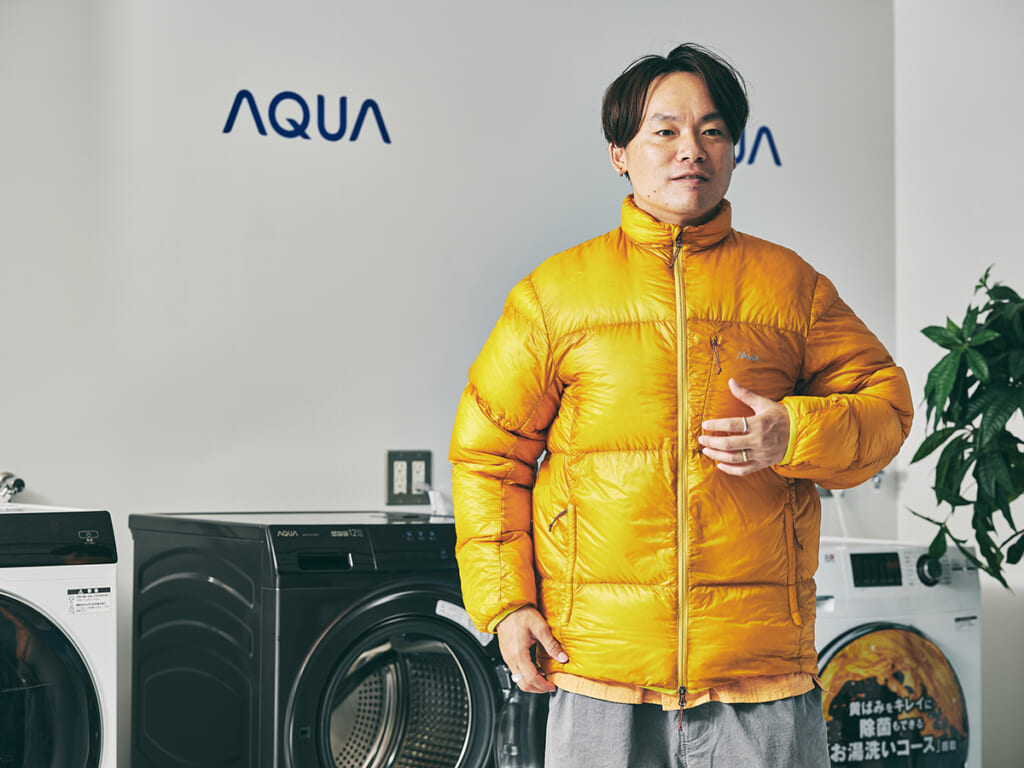 AQUAのドラム式洗濯乾燥機「AQW-DX12R」などに搭載されている注目の機能「エアウォッシュ」。アウトドアウエアのデイリーケアにも最適なこの機能について、AQUAでドラム式洗濯機の企画を担当している石井さんに教えてもらった。