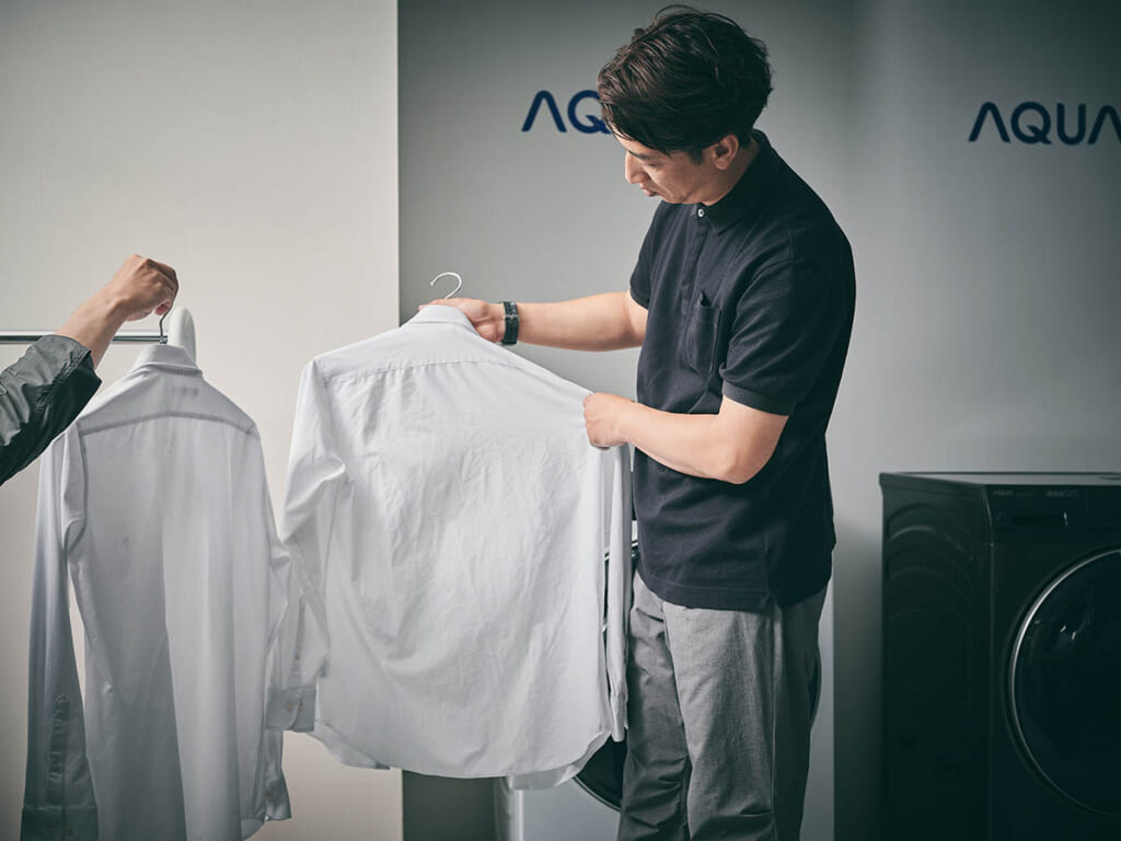 貴史「エアウォッシュで仕上げたワイシャツ(写真左)を見せていただきました。もちろんアイロンがけしたようなパリパリの状態ではないですが、シワが気にならない状態にはなっていました。手間いらずでこのレベルにまで仕上げてくれるなら、忙しい共働き世代は助かります。家では洗いにくいデリケート素材のケアに使えるのも嬉しいです」