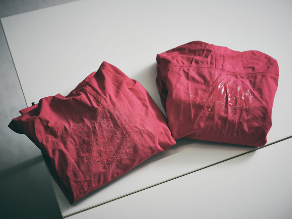 康之「使用前(写真右)ははっ水性能が落ちて水がしみちゃっていますが、エアウォッシュをかけた後(写真左)はしっかり水を弾いていますね。日本だと摩擦と湿度だけでもどんどんはっ水性能が落ちていってしまうので、エアウォッシュで簡単に日常的にケアできるのはいいですね」