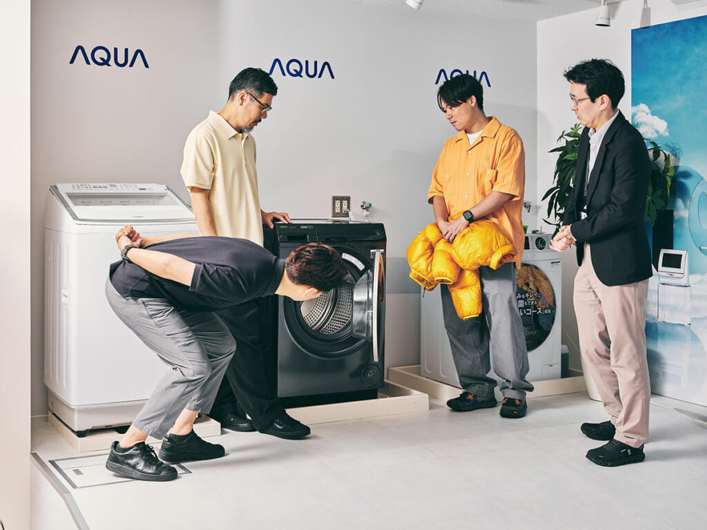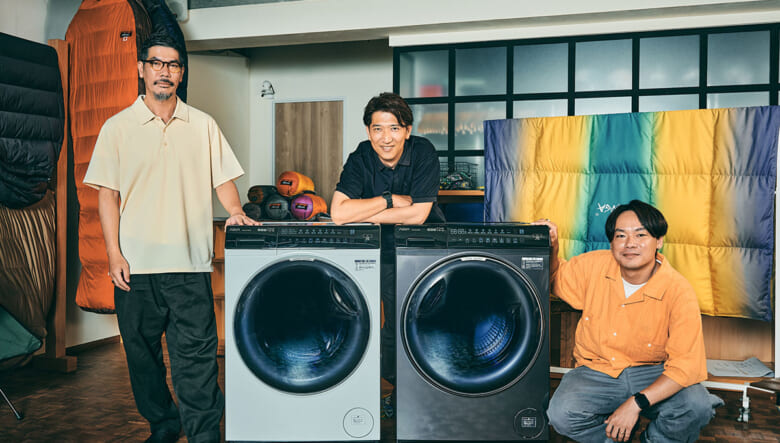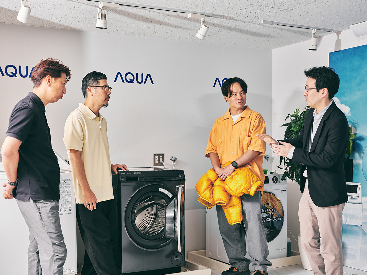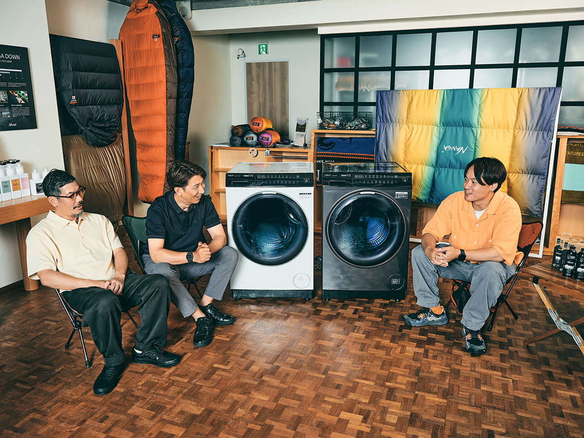 そんなAQUAのドラム式洗濯機の一部に搭載されている機能が、温風ミストとUVライトで衣類をリフレッシュできる機能「エアウォッシュ」。実はこのエアウォッシュ機能がアウトドアウエアのケアもお手軽にできるということで、今回、アクアの東京本社にお邪魔して3人に体験してもらった。