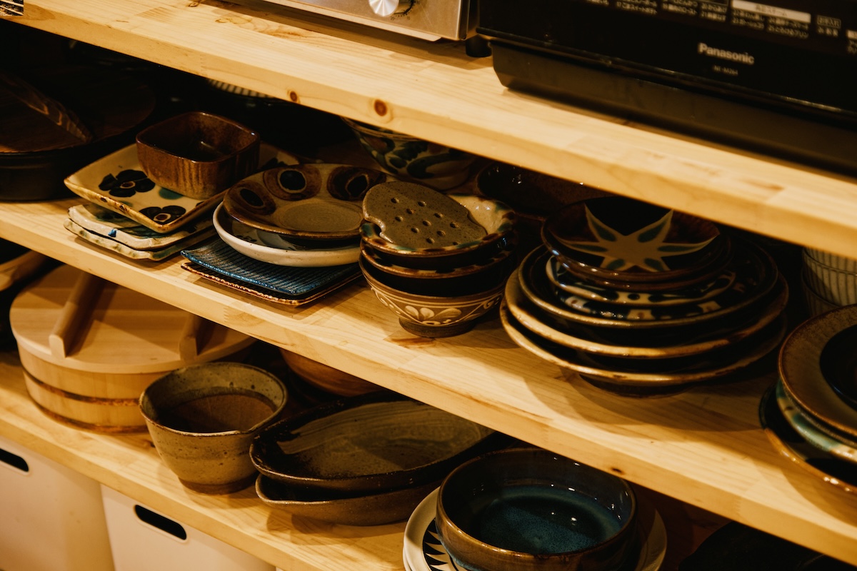 旅先で食器を探すのも、2人の楽しみのひとつ。キッチンの収納スペースには、やちむんや益子焼き、楢岡焼などが並んでいる。先日の東北の旅では、秋田杉の曲げわっぱを入手してきたとか。