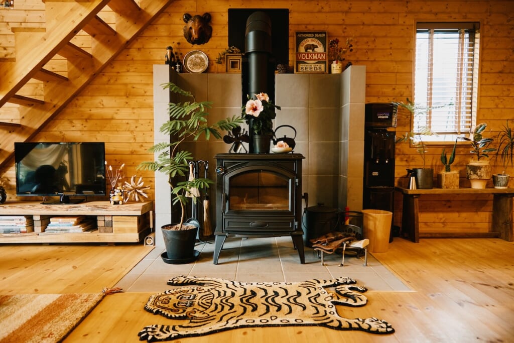 こちらはメインフロアとなる1Fのリビング。その中心には北欧スタイルの薪ストーブ、ドブレが鎮座している。オフシーズンの現在は、植物のディスプレイスペースになっているが、リビングの一部が吹き抜けになっているため、火を入れると家全体が素早く温まるとか。