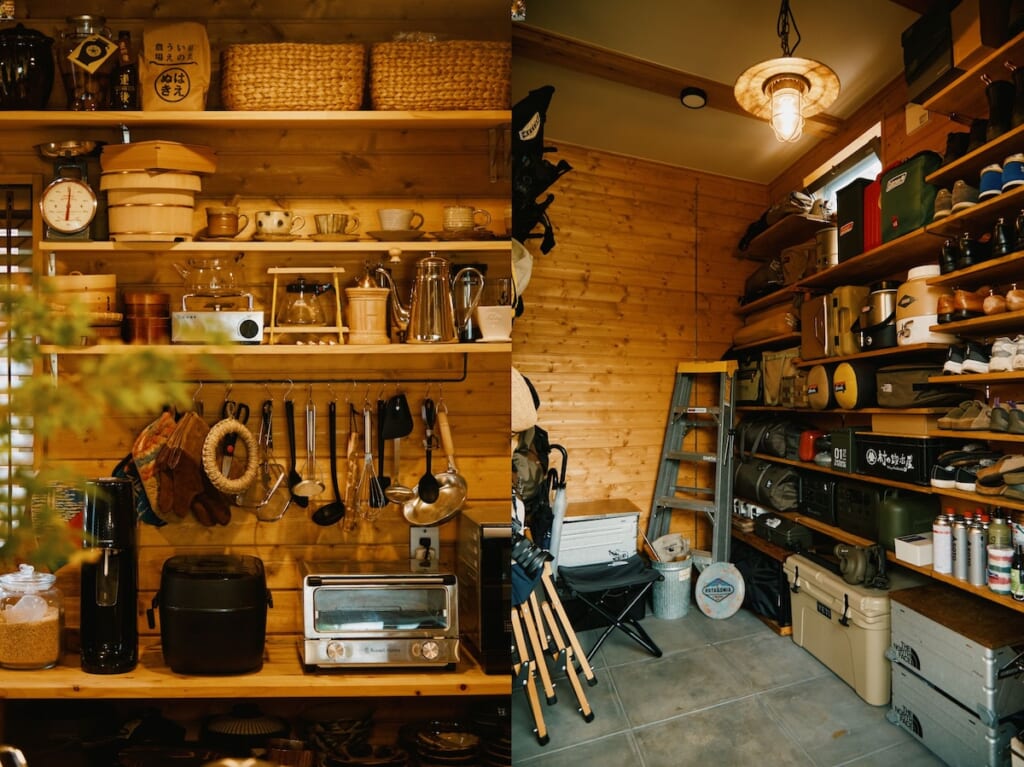 キッチンのウォールラックは、手持ちのキッチンツールに合わせて、聡さんがDIYで作ったそう。玄関をアレンジした土間では、綺麗に整理されたアウトドアギアが出迎えてくれる。こちらの収納棚も聡さんのDIY作品。