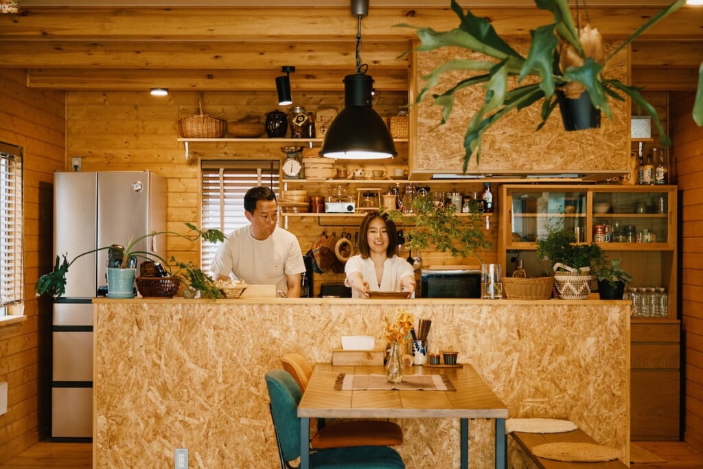 リビングに隣接するアイランドキッチンは、2人が並んで立っても充分に余裕がある広々としたスペースを確保。カウンターやレンジフードにOSB合板を取り入れることで、ウッディながら天然無垢材のウォールとは異なる表情を演出している。