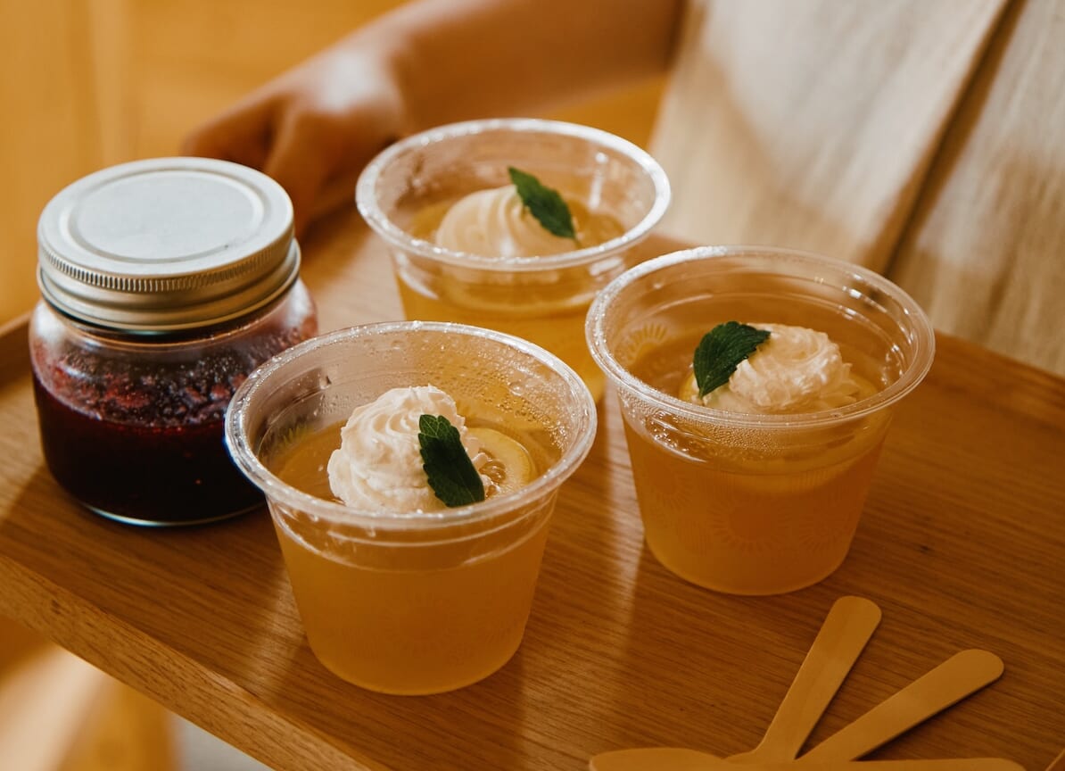 ガーデニングを充実させると同時に、スイーツ作りもナチュラル嗜好に。お手製ゼリーに乗せたミントや、ジャムにしたジューンベリーも庭で採れたもの。