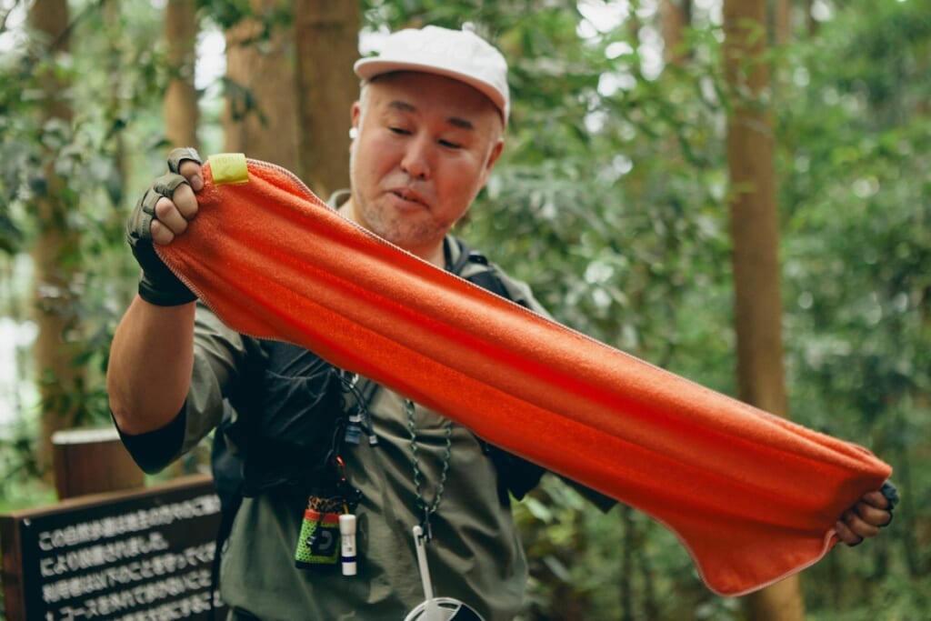辻井さんが首から掛けているタオルは、新たなブランド、ルーのアウトドライヤー。一般的なコットンタオルの4.5倍の吸水力があり、ストレッチ性にも優れている。道中で汗を拭くのに大活躍していた。