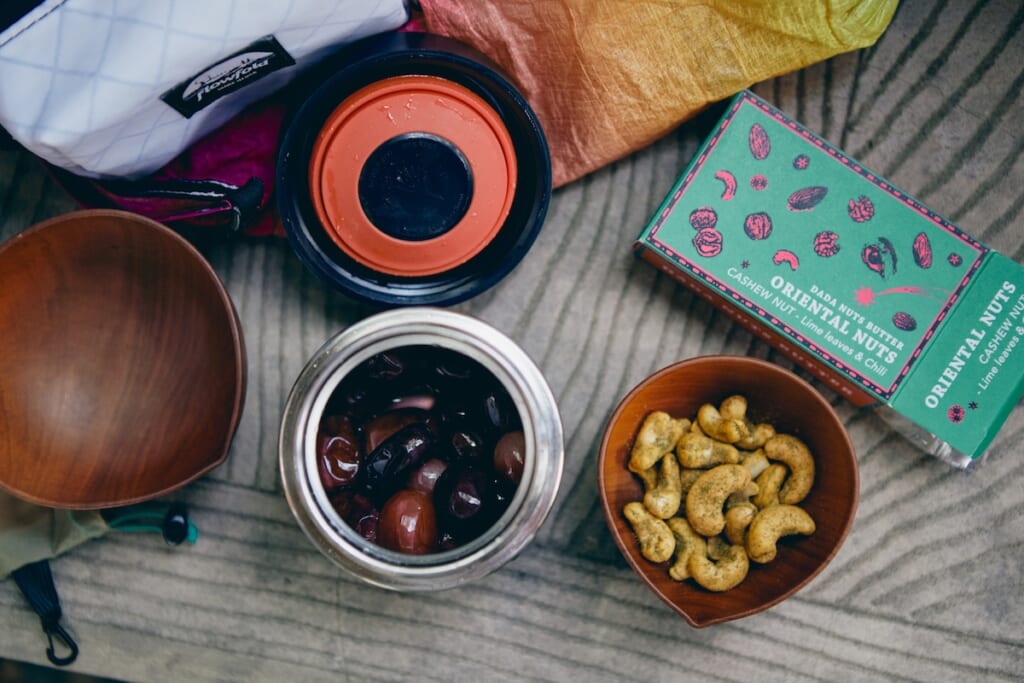 辻井さんはハイドロフラスクのフードコンテナに冷凍ブドウを持参。さらにオリエンタルナッツのカシューナッツも用意。