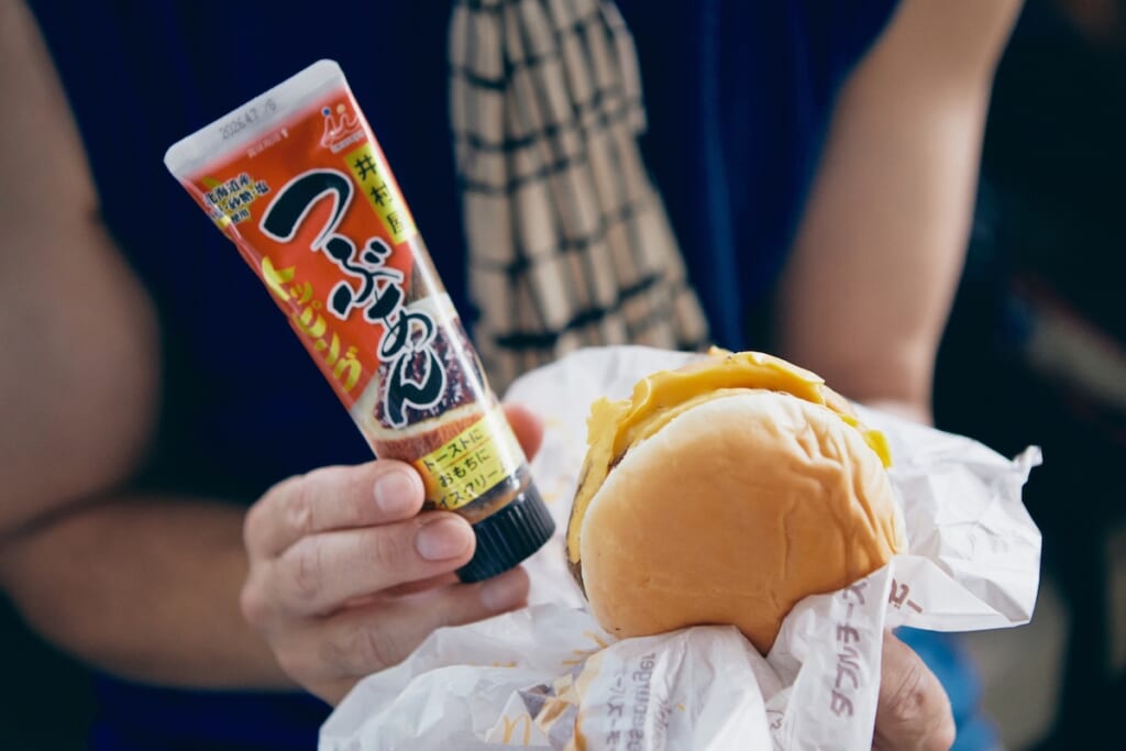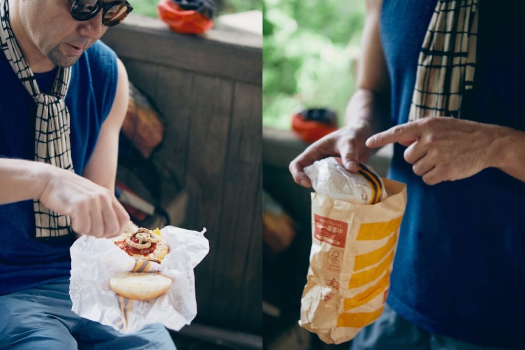 一方、キャンさんがバッグから取り出したのは、なんとマクドナルドのダブルチーズバーガー。しかも粒マスタードやケチャップを、ワイルドに後掛けするスタイル。