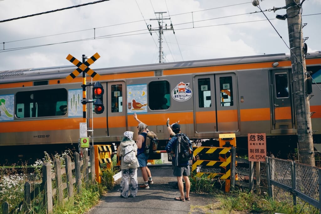 目の前にはJR青梅線の踏切も。予定よりスピーディに下山できてテンションがおかしくなっているのか、電車に向かって嬉しそうに手を振るキャンさんと辻井さん。