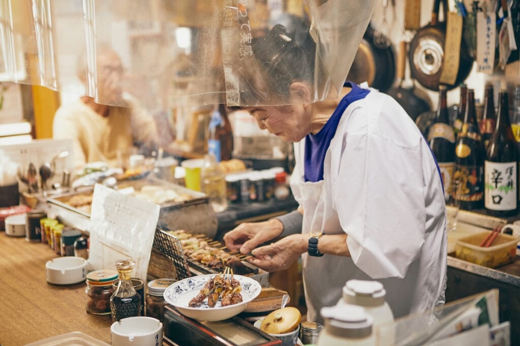 「やきとり銀嶺」は、1949年から続く老舗酒場。その歴史を感じさせるレトロな佇まいで、昔からずっと女将さんが1人で切り盛りしている。