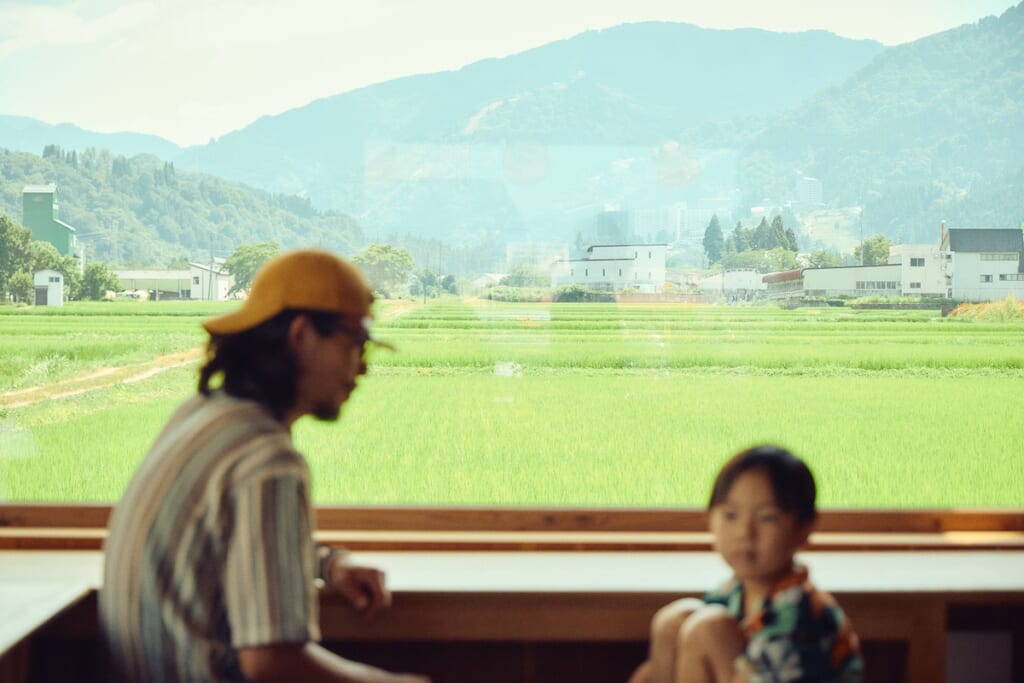 ここは、美しい景色が自慢の「FARM FRONT SEKINOEN」。関農園という、南魚沼産コシヒカリの生産農家が運営する直売所兼おむすび屋で、店内から望む田園風景は、まさに日本の原風景そのもの。