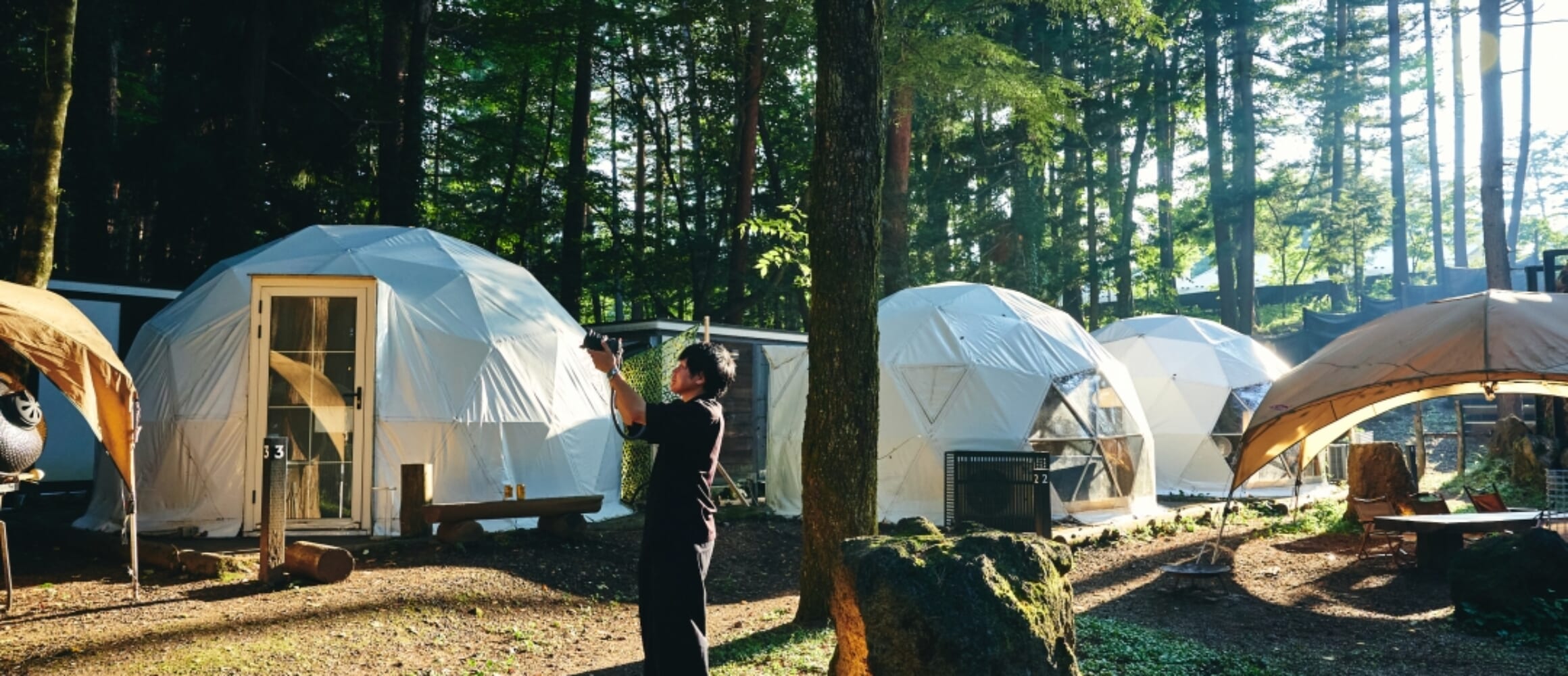 午後からは、富士五湖エリアに移動し、人気の施設「グランピングヴィラハンズ河口湖」へ。同施設は、充実した宿泊設備とサービス、富士山を望むロケーションが人気。