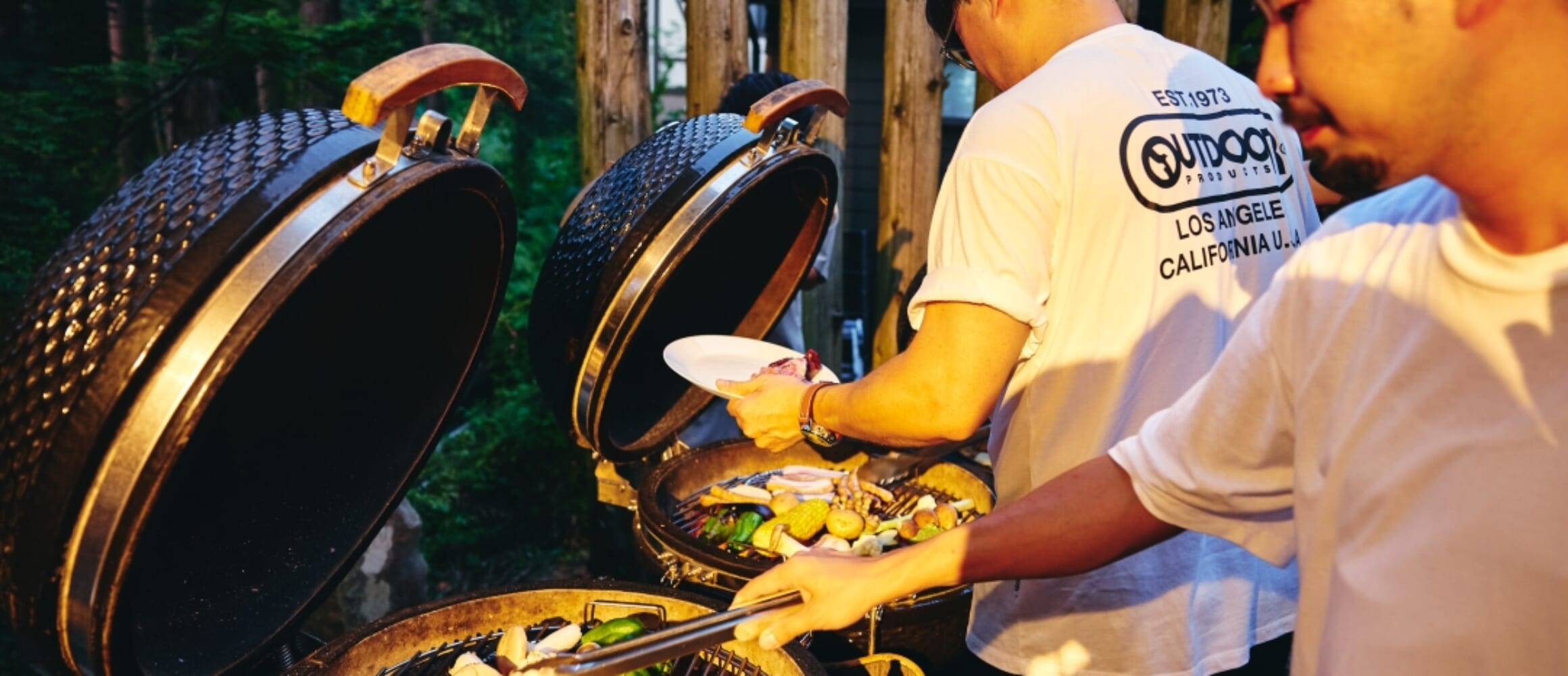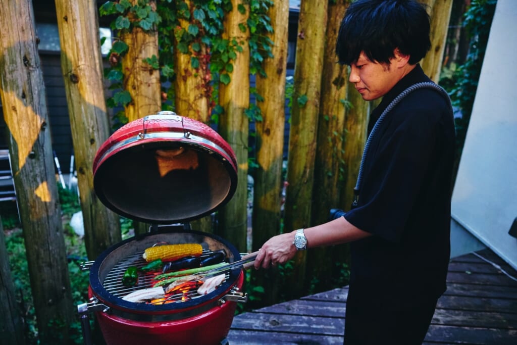 夜は、本格的なバーベキュー体験。アメリカの家庭の庭にあるような大型のフタ付きグリルで肉や野菜を焼きつつ、各国のクリエイターとハミルトンのスタッフとの交流が行われました。