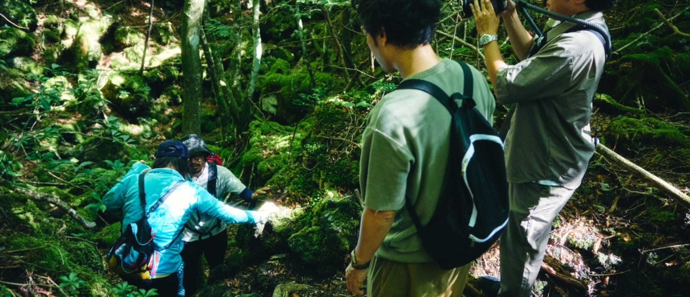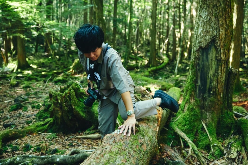 「普段のアウトドアアクティビティは、カヤックで水辺のフィールドに繰り出すことが多いので、ハイキングは新鮮な体験でした。まるでジブリの世界に迷い込んだかのようなロケーションで、いい感じの木漏れ日や、苔があって撮影が楽しかったです。」