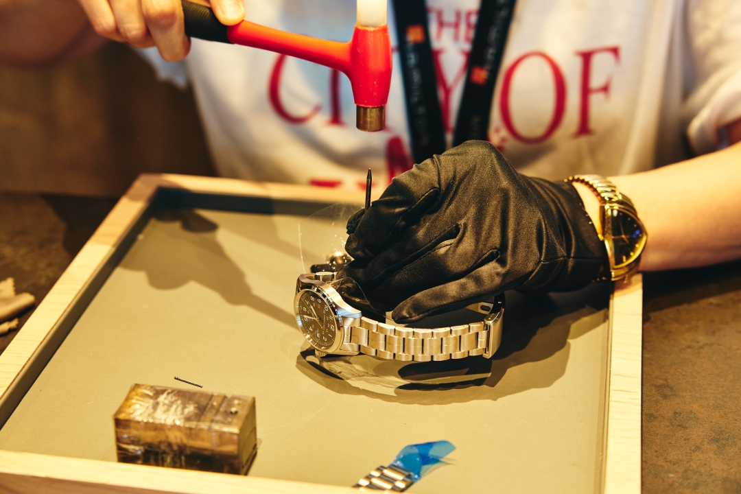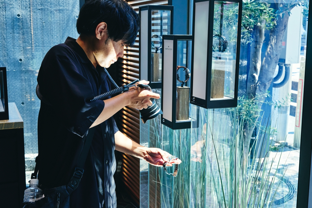 まずはそれぞれ「カーキ」コレクションの時計を受け取り、フィッティング。レーザーによる名入れも行われました。刻印が始まって完了するまでの時間はわずか1分以内。旗艦店では、無料で名入れをすることが出来ます。