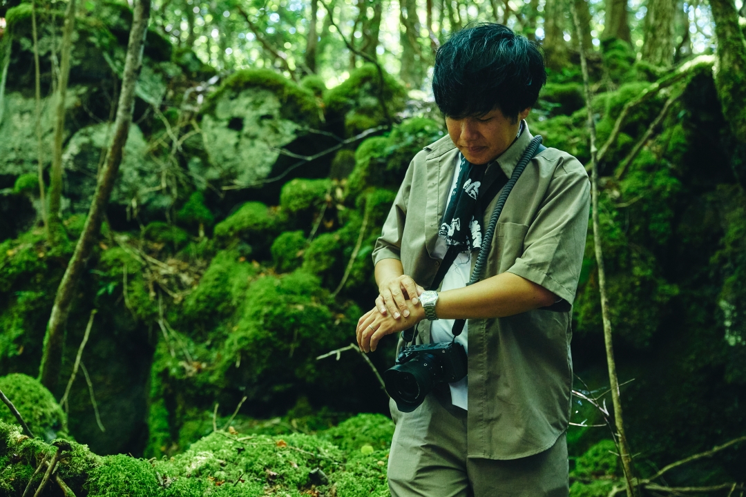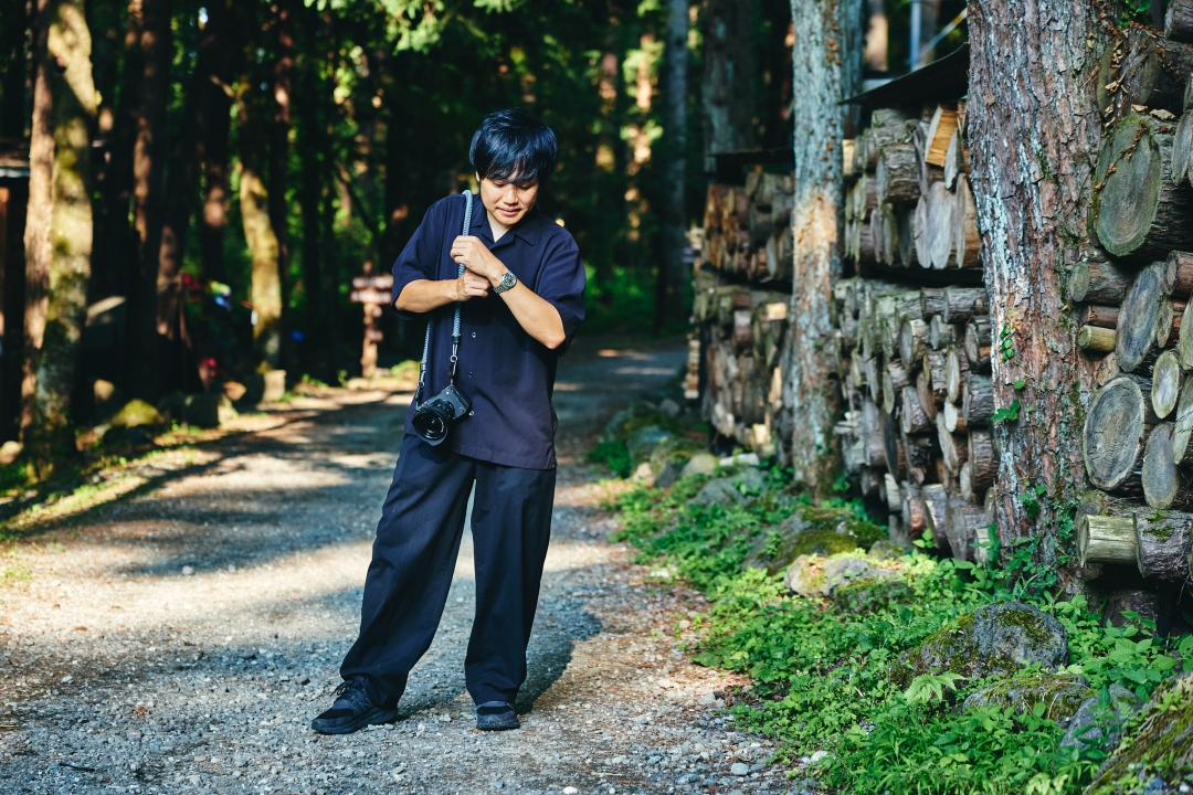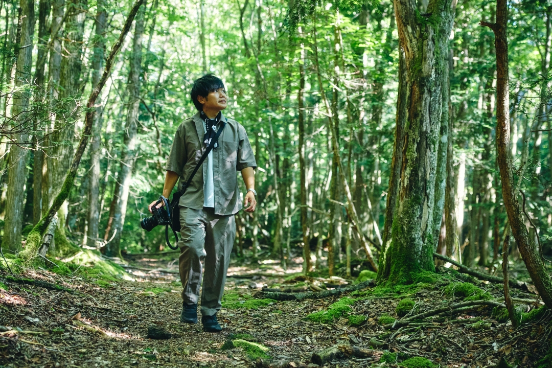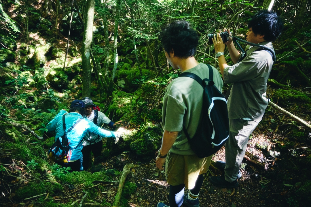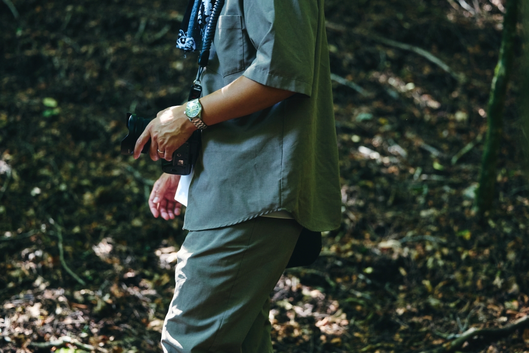 「普段のアウトドアアクティビティは、カヤックで水辺のフィールドに繰り出すことが多いので、ハイキングは新鮮な体験でした。まるでジブリの世界に迷い込んだかのようなロケーションで、いい感じの木漏れ日や、苔があって撮影が楽しかったです。」