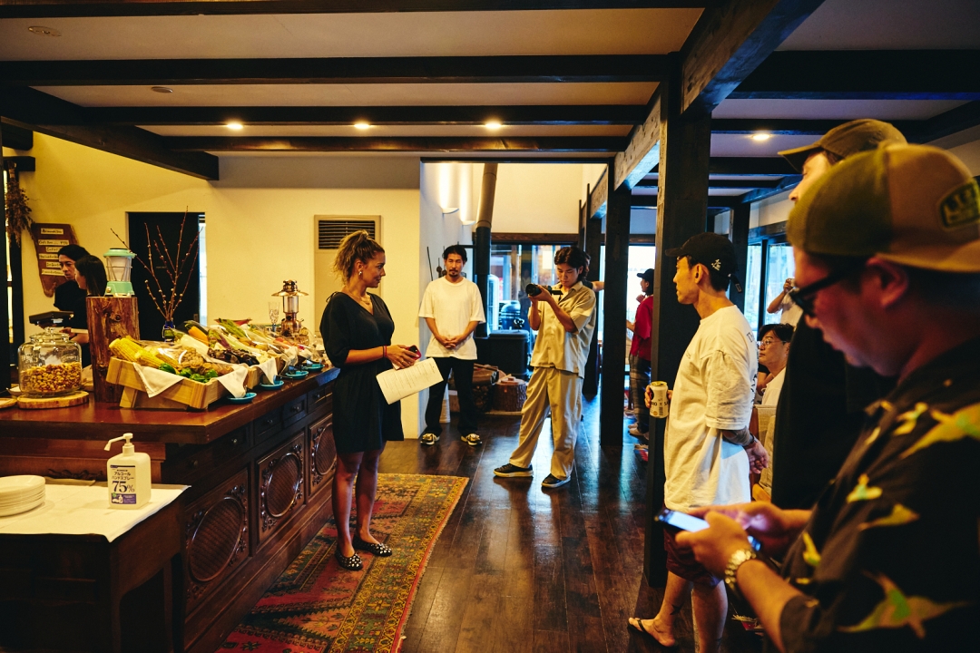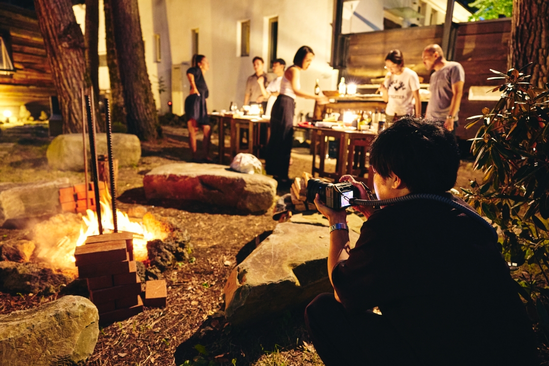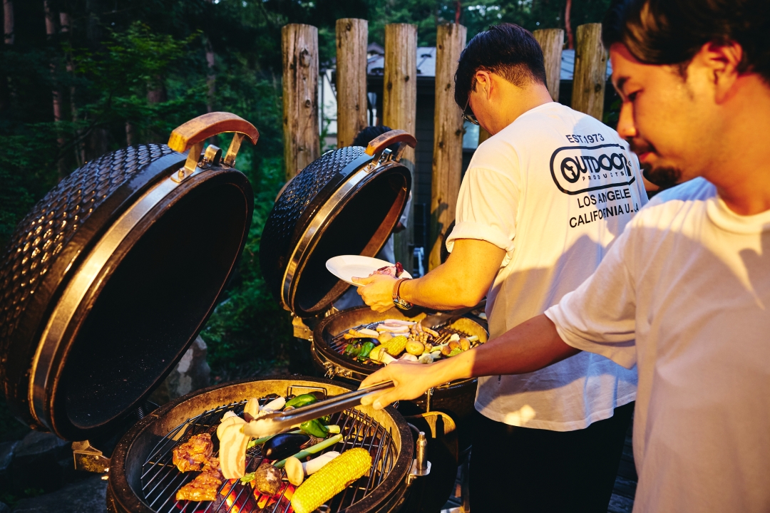 夜は、本格的なバーベキュー体験。アメリカの家庭の庭にあるような大型のフタ付きグリルで肉や野菜を焼きつつ、各国のクリエイターとハミルトンのスタッフとの交流が行われました。