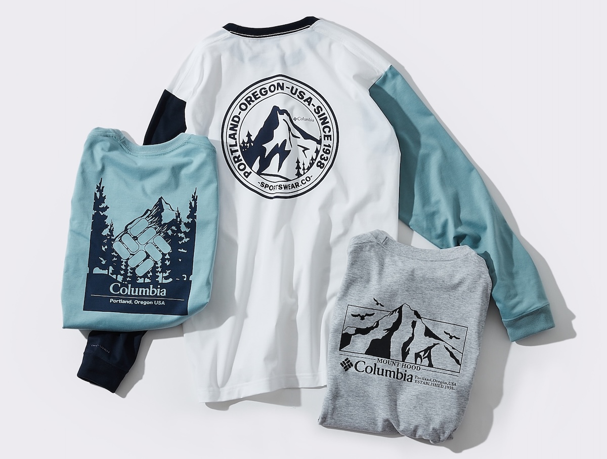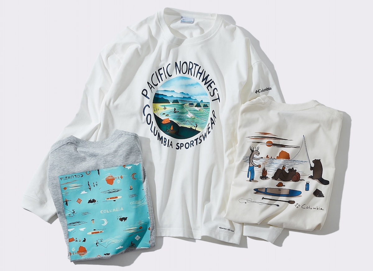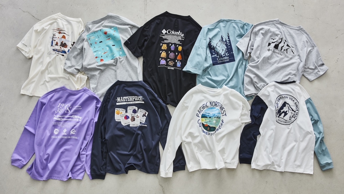 コロンビアの創業地となる、オレゴン州の海岸沿いのアウトドアシーンをイメージしたグラフィックが描かれている。Tシャツ、ロンT、フロントプロント、バックプリントとバリエーションも様々。