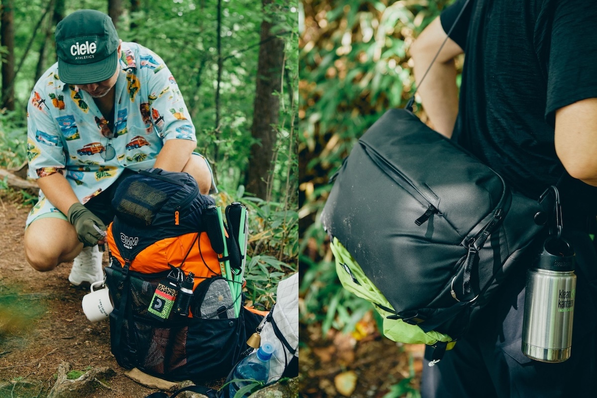 同じく、かさばるコーヒーセットを持参してくれた藤巻さんは、ピークデザインのカメラ用ショルダーバッグを活用。これくらいの低山なら、バックパックじゃなくても快適に歩けるとか。