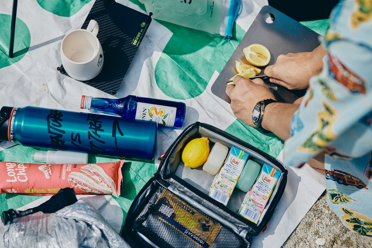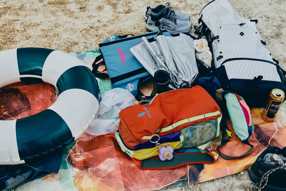 浮き輪からカクテルセットまで収納されていた辻井さんのバックパックは、OMMの40Lモデル。本来ならテント泊できるサイズだけど、今回はビーチグッズ満載でパンパンに。