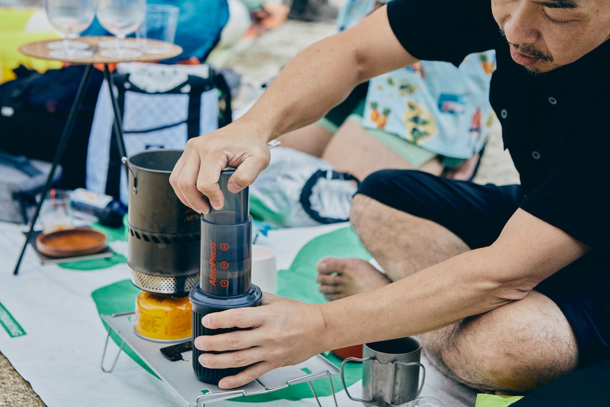 まずは藤巻さんが、エアロプレスを使ったアイスコーヒーを用意。MSRの名作ストーブ、リアクターを使って速攻でお湯を沸かし、ミルで挽いたばかりの豆で極上のコーヒーを提供してくれた。
