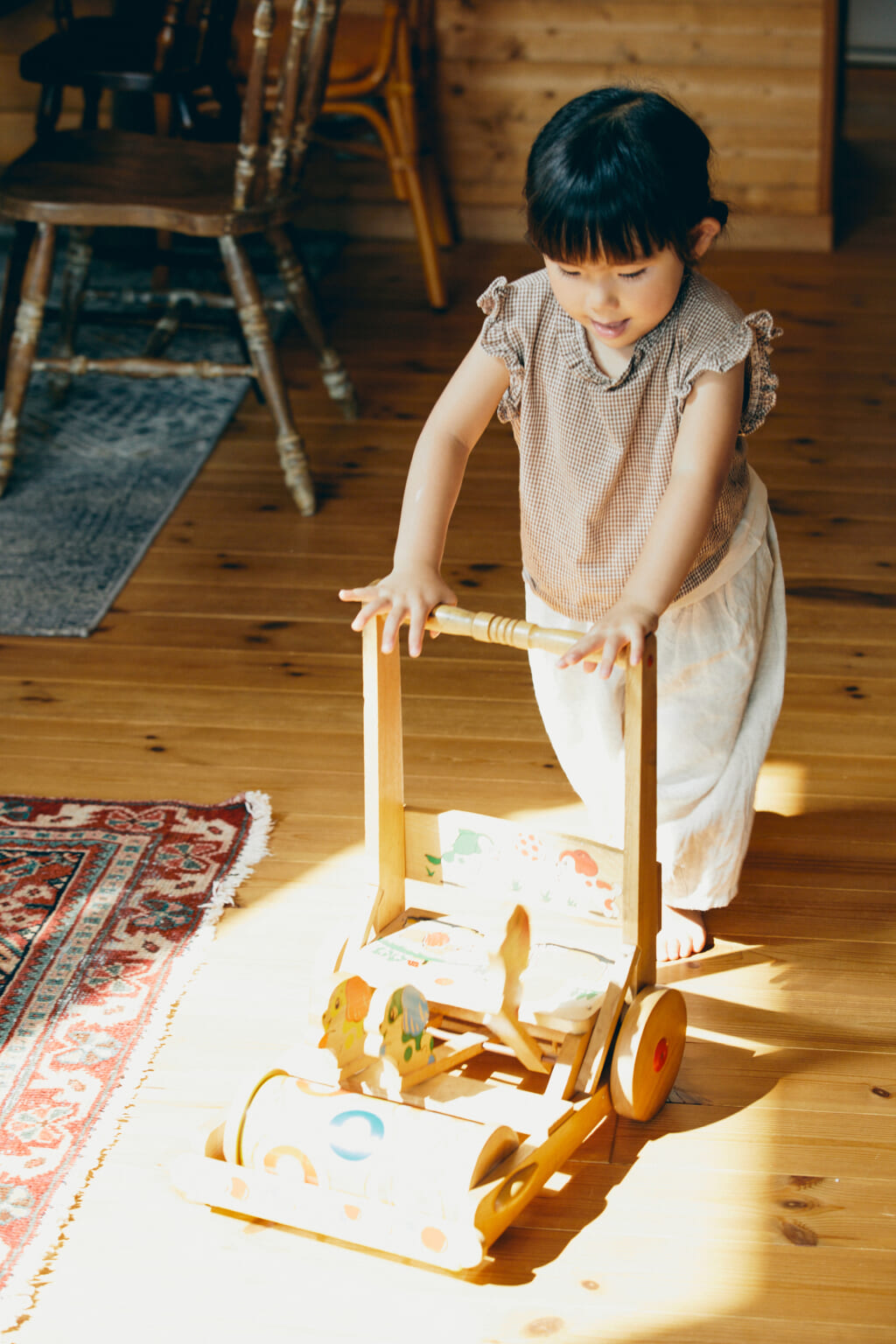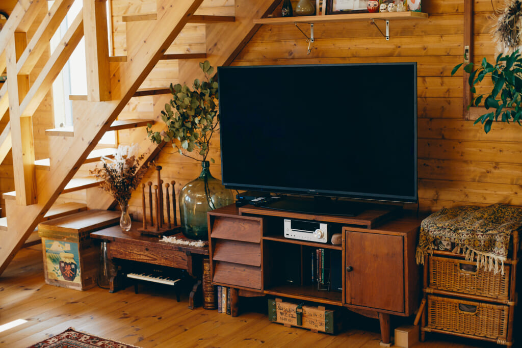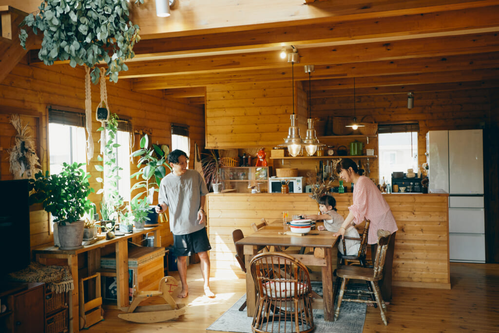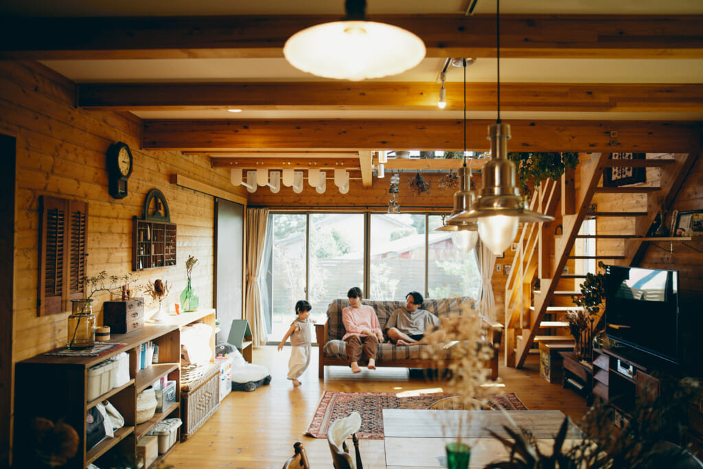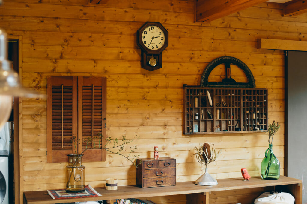 「家は、BESSのような木をふんだんに使った家がいいとずっと考えていました。それは妻も同じ。展示場へ行き、程々の家と悩んだのですが、シャープな印象と外壁の手入れも考慮してワンダーデバイスを選びました」。そんなウッディーな雰囲気の室内には、夫婦共通の好みであるヴィンテージものやレトロな雰囲気の家具が並びます。