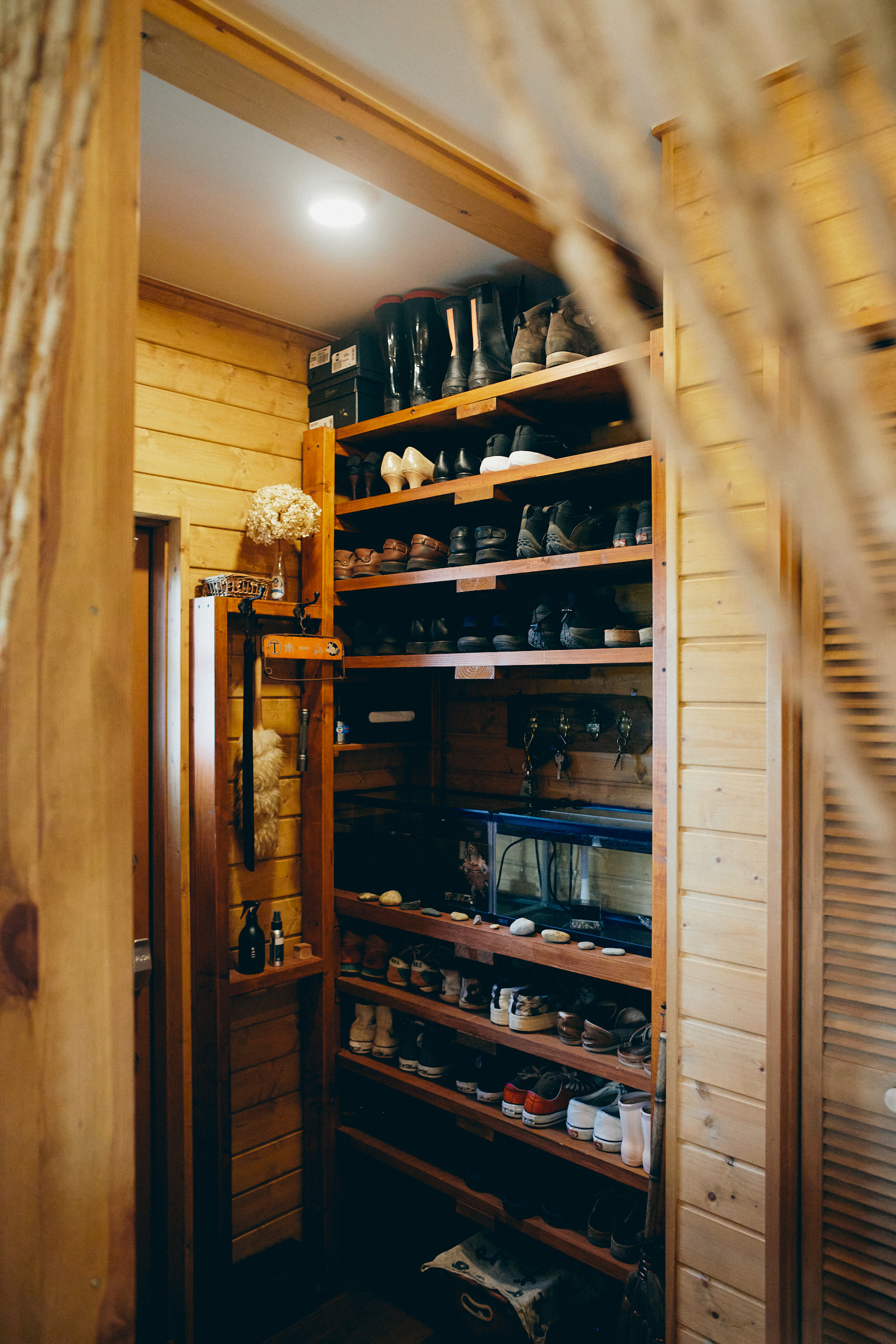 そのほかにも、冷蔵庫横にパントリー的な細長い収納棚を作ったり、玄関のシューズラックも幅ぴったりのサイズで使いやすくDIY。靴棚には朋子さんの好きなCONVERSEが並ぶ。