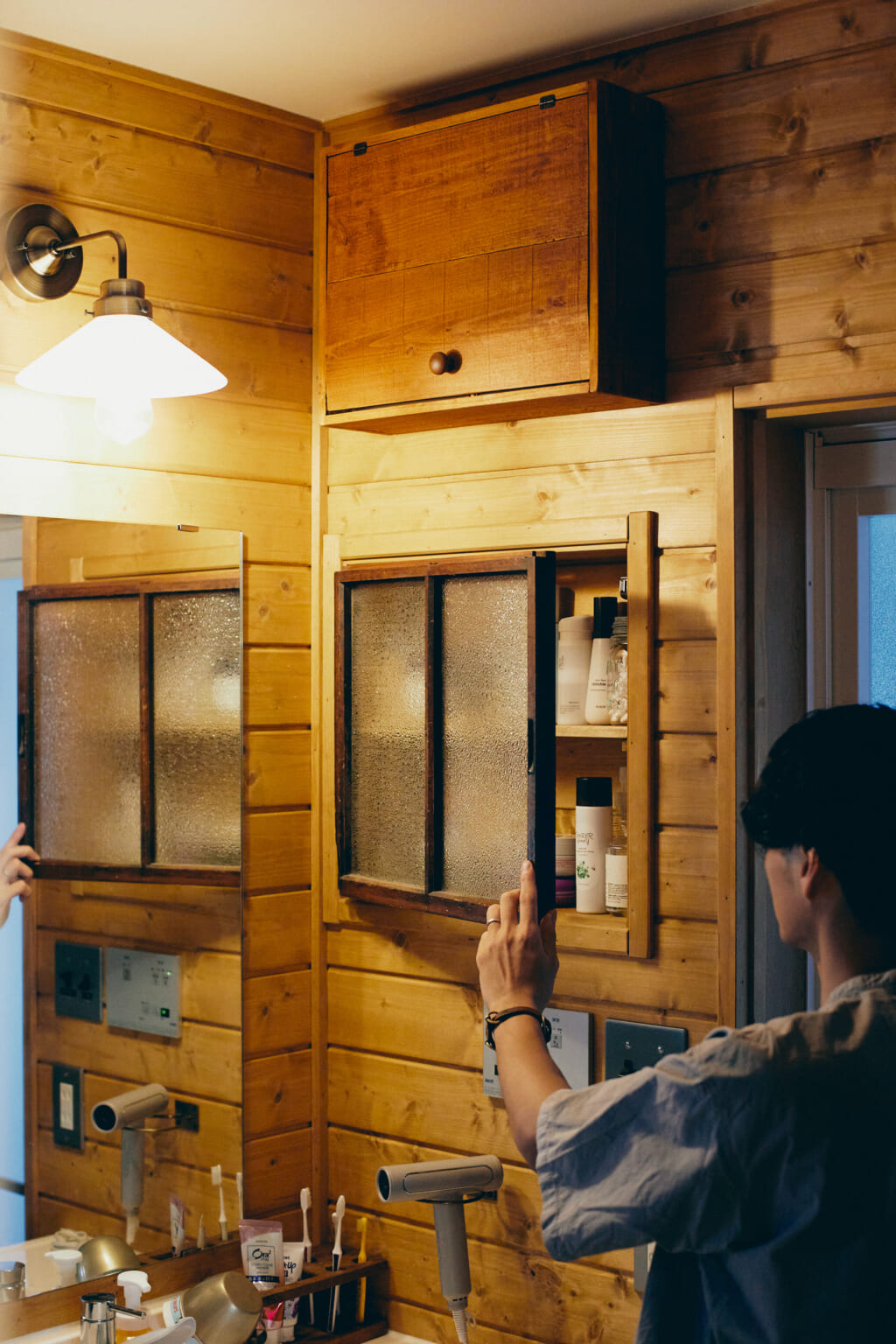 また、洗面所の壁収納には、古いガラス扉を自ら設置。「偶然見つけた古い扉のサイズがピッタリだったので、金具を付けて収納の扉にしました。上の配電盤は、木の壁と色味を合わせて目隠しを自作しています」。