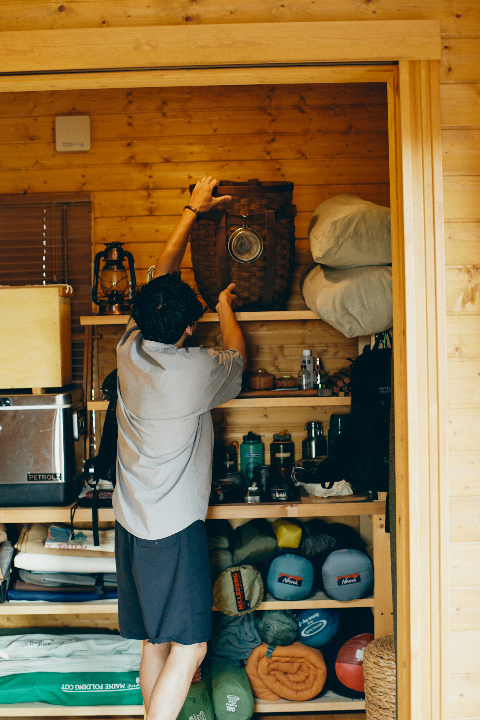 キャンプギアはリビング横のスペースに自作の棚を入れて保管中。「ギアはレトロなものも好きですが、機能性重視なUL系も使います。時々ソロキャンに行くのですが、そのときに愛用しているのがフロストリバーの背負子。1人用のギアをすべて入れ、これひとつでキャンプ場に行きます」。